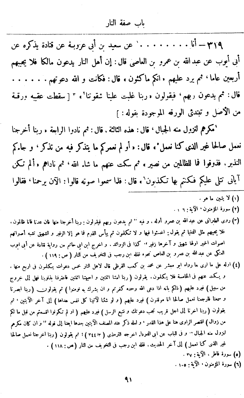 أنا. . .، عَنْ سَعِيدِ بْنِ أَبِي عَرُوبَةَ، عَنْ قَتَادَةَ، يَذْكُرُهُ عَنْ أَبِي أَيُّوبَ، عَنْ عَبْدِ اللَّهِ بْنِ عَمْرِو بْنِ الْعَاصِ، قَالَ: " إِنَّ أَهْلَ النَّارِ يَدْعُونَ مَالِكًا فَلَا يُجِيبُهُمْ أَرْبَعِينَ عَامًا، ثُمَّ يَرُدُّ عَلَيْهِمْ: {إِنَّكُمْ مَاكِثُونَ} [الزخرف: ٧٧] قَالَ: فَكَانَتْ وَاللَّهِ دَعْوَتَهُمْ. . . قَالَ: ثُمَّ يَدْعُونَ رَبَّهُمْ، فَيَقُولُونَ: {رَبَّنَا غَلَبَتْ عَلَيْنَا شِقْوَتُنَا} [المؤمنون: ١٠٦] . . . {مَكْرُهُمْ لِتَزُولَ مِنْهُ الْجِبَالُ} [إبراهيم: ٤٦] قَالَ: هَذِهِ الثَّالِثَةُ قَالَ: ثُمَّ نَادَوُا الرَّابِعَةَ: {رَبَّنَا أَخْرِجْنَا نَعْمَلْ صَالِحًا غَيْرَ الَّذِي كُنَّا نَعْمَلُ} [فاطر: ٣٧] قَالَ: {أَوَلَمْ نُعَمِّرْكُمْ مَا يَتَذَكَّرُ فِيهِ مَنْ تَذَكَّرَ وَجَاءَكُمُ النَّذِيرُ فَذُوقُوا فَمَا لِلظَّالِمِينَ مِنْ نَصِيرٍ} [فاطر: ٣٧] ، ثُمَّ سَكَتَ عَنْهُمْ مَا شَاءَ اللَّهُ، ثُمَّ نَادَاهُمْ: {أَلَمْ تَكُنْ آيَاتِي تُتْلَى عَلَيْكُمْ فَكُنْتُمْ بِهَا تُكَذِّبُونَ} [المؤمنون: ١٠٥] قَالَ: فَلَمَّا سَمِعُوا صَوْتَهُ قَالُوا: الْآنَ يَرْحَمُنَا، فَقَالُوا ⦗٩٢⦘ عِنْدَ ذَلِكَ: {رَبَّنَا غَلَبَتْ عَلَيْنَا شِقْوَتُنَا} [المؤمنون: ١٠٦] أَيِ الْكِتَابُ الَّذِي كُتِبَ عَلَيْنَا، {وَكُنَّا قَوْمًا ضَالِّينَ رَبَّنَا أَخْرِجْنَا مِنْهَا فَإِنْ عُدْنَا فَإِنَّا ظَالِمُونَ} [المؤمنون: ١٠٧] ، قَالَ عِنْدَ ذَلِكَ: {اخْسَئُوا فِيهَا وَلَا تُكَلِّمُونِ} فَانْقَطَعَ عِنْدَ ذَلِكَ الدُّعَاءُ وَالرَّجَاءُ مِنْهُمْ، وَأَقْبَلَ بَعْضُهُمْ عَلَى بَعْضٍ، بَعْضُهُمْ فِي وَجْهِ بَعْضٍ، فَأُطْبِقَتْ عَلَيْهِمْ قَالَ: فَحَدَّثَنِي الْأَزْهَرُ بْنُ أَبِي الْأَزْهَرِ أَنَّهُ ذُكِرَ لَهُ أَنَّ ذَلِكَ قَوْلُهُ: {هَذَا يَوْمُ لَا يَنْطِقُونَ وَلَا يُؤْذَنُ لَهُمْ فَيَعْتَذِرُونَ} [المرسلات: ٣٥] "