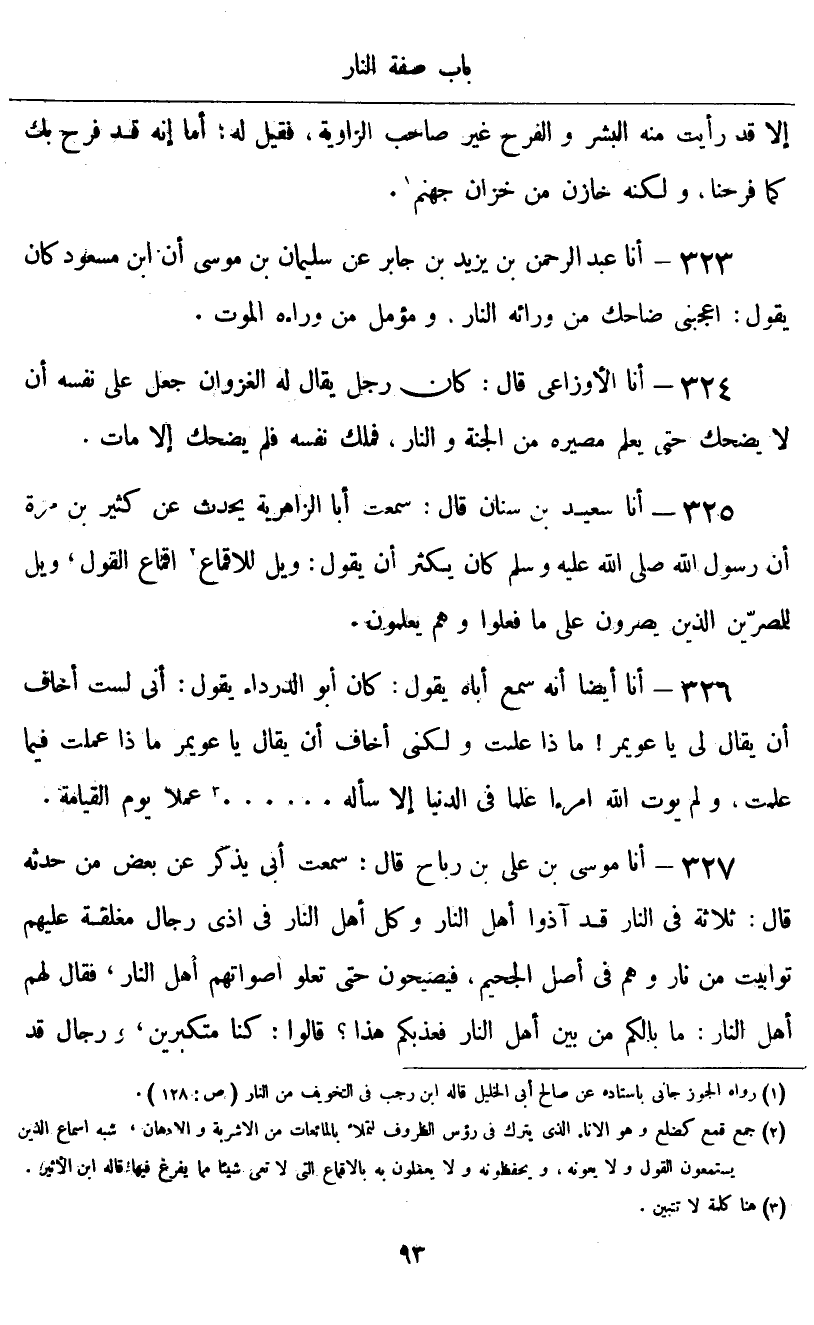 أَنَا الْأَوْزَاعِيُّ قَالَ: كَانَ رَجُلٌ يُقَالُ لَهُ الْغَزْوَانُ «جَعَلَ عَلَى نَفْسِهِ أَلَّا يَضْحَكَ حَتَّى يَعْلَمَ مَصِيرَهُ مِنَ الْجَنَّةِ وَالنَّارِ، فَمَلَكَ نَفْسَهُ فَلَمْ يَضْحَكْ إِلَى أَنْ مَاتَ»