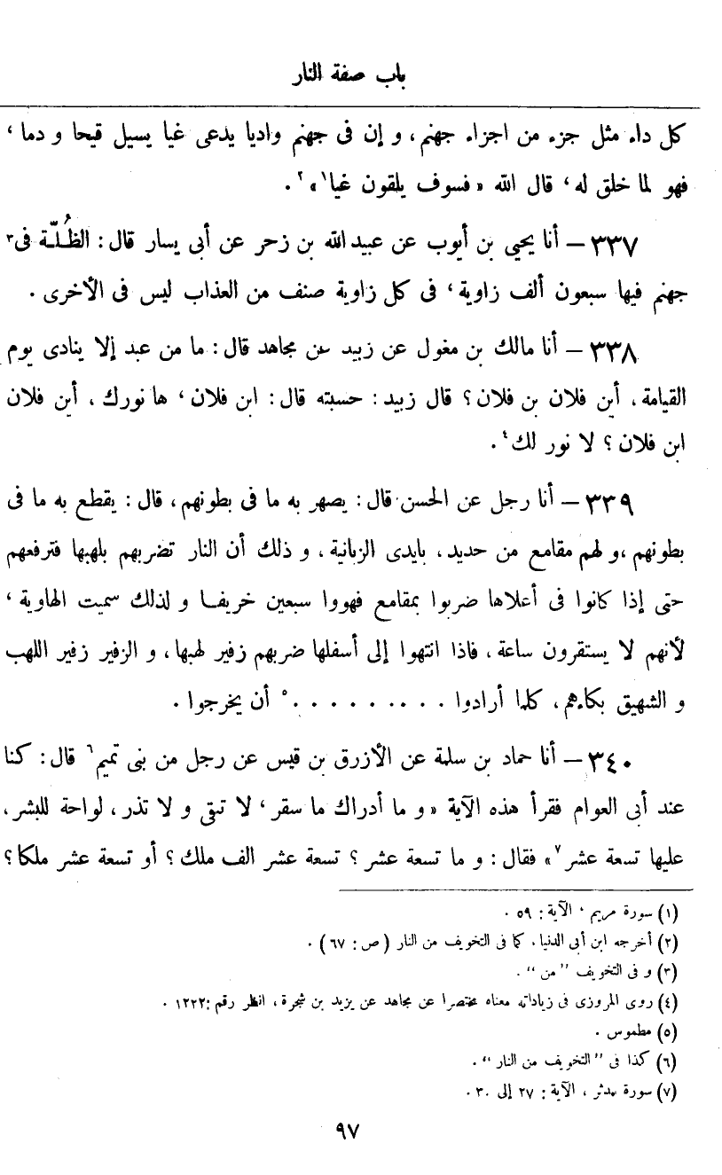 أَنَا حَمَّادُ بْنُ سَلَمَةَ، عَنِ الْأَزْرَقِ بْنِ قَيْسٍ، عَنْ رَجُلٍ مِنْ بَنِي تَمِيمٍ قَالَ: كُنَّا عِنْدَ أَبِي الْعَوَّامِ، فَقَرَأَ هَذِهِ الْآيَةَ: {وَمَا أَدْرَاكَ مَا سَقَرُ لَا تُبْقِي وَلَا تَذَرُ لَوَّاحَةٌ لِلْبَشَرِ عَلَيْهَا تِسْعَةَ عَشَرَ} [المدثر: ٢٨] فَقَالَ: " وَمَا تِسْعَةَ عَشَرَ؟ تِسْعَةَ عَشَرَ أَلْفَ مَلَكٍ؟ أَوْ تِسْعَةَ عَشَرَ مَلَكًا؟ ⦗٩٨⦘ قَالَ: قُلْتُ: بَلْ تِسْعَةَ عَشَرَ مَلَكًا قَالَ: وَأَنَّى تَعْلَمُ ذَلِكَ، فَقُلْتُ: لِقَوْلِ اللَّهِ: {وَمَا جَعَلْنَا عِدَّتَهُمْ إِلَّا فِتْنَةً لِلَّذِينَ كَفَرُوا. . .} [المدثر: ٣١] قَالَ أَبُو الْعَوَّامِ: «صَدَقْتَ، وَبِيَدِ كُلِّ وَاحِدٍ مِنْهُمْ مِرْزَبَّةٌ مِنْ حَدِيدٍ لَهَا شُعْبَتَانِ، فَيُضْرَبُ بِهَا الضَّرْبَةَ يَهْوِي بِهَا سَبْعِينَ أَلْفًا، كَذَا بَيْنَ مِنْكَبَيْ كُلِّ مَلَكٍ مِنْهُمْ مَسِيرَةُ كَذَا»