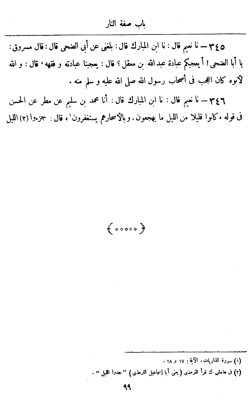 نا نُعَيْمٌ قَالَ: نا ابْنُ الْمُبَارَكِ قَالَ: أنا مُحَمَّدُ بْنُ سُلَيْمٍ، عَنْ مَطَرٍ، عَنِ الْحَسَنِ، فِي قَوْلِهِ: {كَانُوا قَلِيلًا مِنَ اللَّيْلِ مَا يَهْجَعُونَ وَبِالْأَسْحَارِ هُمْ يَسْتَغْفِرُونَ} [الذاريات: ١٨] قَالَ: «جَزَّءُوا اللَّيْلَ»