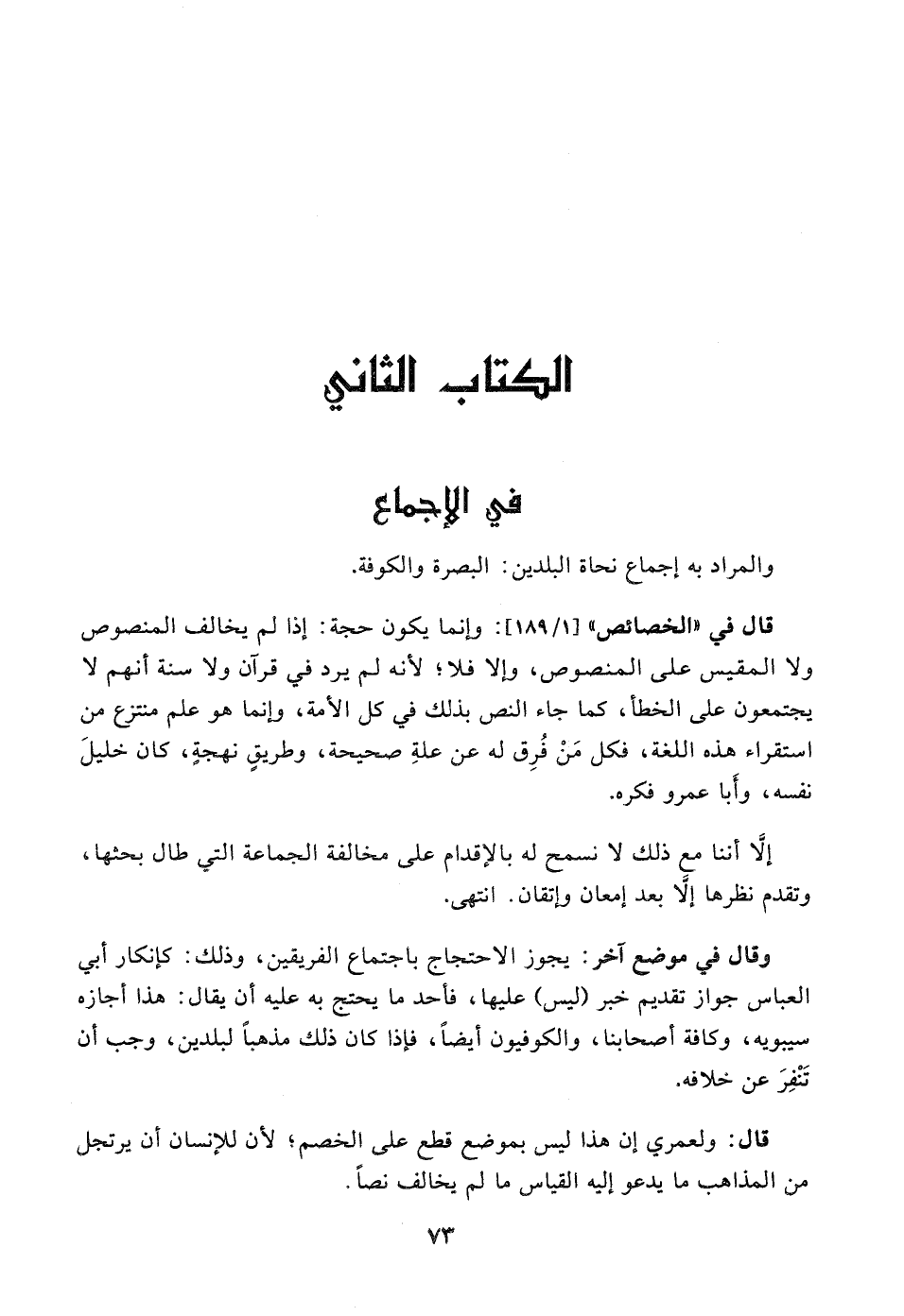 وإنما يكون حجة إذا لم يخالف المنصوص ولا المقيس على المنصوص وإلا فلا لأنه لم يرد في القرآن ولا سنة أنهم لا يجتمعون على الخطأ كما جاء النص بذلك في كل الأمة وإنما هو علم ينتزع من استقراء هذه اللغة فكل من فرق له عن علة صحيحة وطريق نهجة كان خليل نفسه وأبا عمرو فكره ".