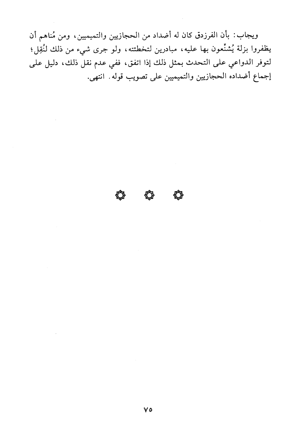 ويجاب بأن الفرزدق كان له أضداد من الحجازيين والتميميين، ومن مناهم أن يظفروا له بزلة يشنعون بها عليه، مبادرين لتخطئته.