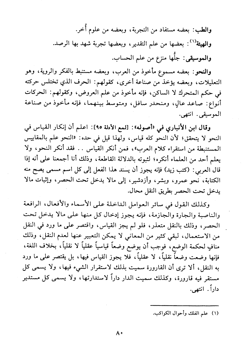وكذلك القول في سائر العوامل الداخلة على الأسماء والأفعال الرافعة والناصبة والجارة والجازمة؛ فإنه يجوز إدخال كل منها على ما لا يدخل تحت الحصرن وذلك بالنقل متعذر، فلو لم يجز القياس واقتصر على ما ورد في النقل من الاستعمال لبقي كثير من المعاني لا يمكن التعبير عنها لعدم النقلن وذلك مناف لحكمة الوضع، فوجب أن يوضع وضعا قياسيا عقليا لا نقليا، بخلاف اللغة، فإنها وضعت وضعا نقليا لا عقليا، فلا يجوز القياس فيها، بل يقتصر على ما ورد به النقل، ألا ترى أن (القارورة) سميت بذلك لاستقرار الشيء فيها، ولا يسمى كل مستقر فيه قارورة، وكذلك سميت (الدار) دارا لاستدارتها ولا يسمى كل مستدير دارا) انتهى.