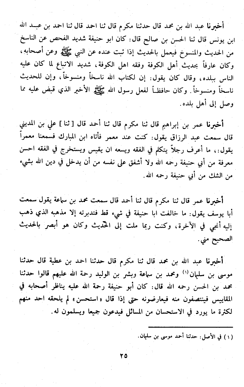 أخبرنَا عبد الله بن مُحَمَّد قَالَ ثَنَا مكرم قَالَ حَدثنَا احْمَد بن عَطِيَّة قَالَ حَدثنَا مُوسَى بن سُلَيْمَان وَمُحَمّد بن سَمَّاعَة وَبشر بن الْوَلِيد رَحْمَة الله عَلَيْهِم قَالُوا حَدثنَا مُحَمَّد بن الْحسن رَحمَه الله قَالَ كَانَ أَبُو حنيفَة رَحْمَة الله عَلَيْهِ يناظر أَصْحَابه فِي المقاييس فينتصفون مِنْهُ فيعارضونه حَتَّى إِذا قَالَ اسْتحْسنَ لم يلْحقهُ اُحْدُ مِنْهُم لِكَثْرَة مَا يُورد فِي الِاسْتِحْسَان من الْمسَائِل فَيدعونَ جَمِيعًا ويسلمون لَهُ