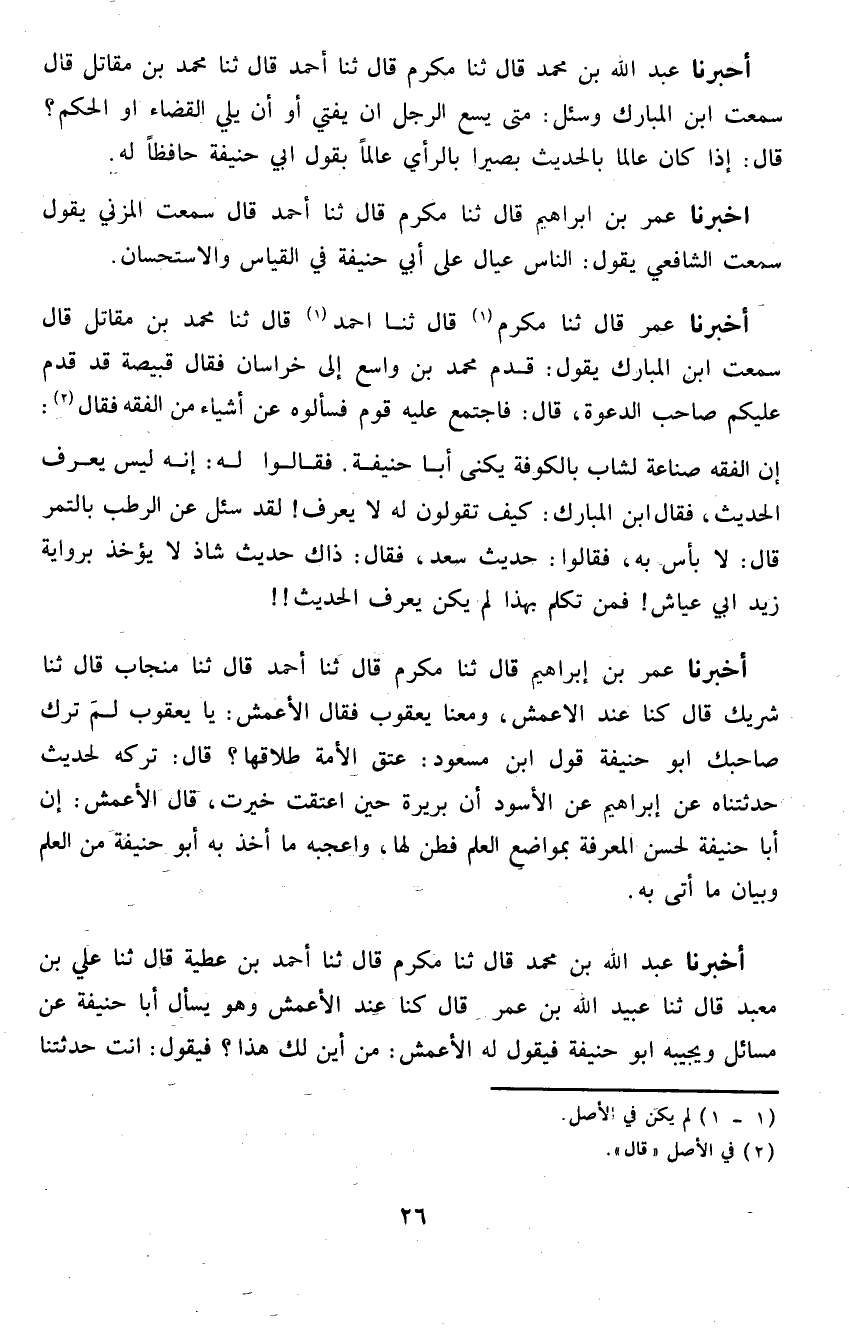 أخبرنَا عمر قَالَ ثَنَا مكرم قَالَ ثَنَا احْمَد قَالَ ثَنَا مُحَمَّد بن مقَاتل قَالَ سَمِعت ابْن الْمُبَارك يَقُول قدم مُحَمَّد بن وَاسع إِلَى خُرَاسَان فَقَالَ قبيصَة قد قدم عَلَيْكُم صَاحب الدعْوَة قَالَ فَاجْتمع عَلَيْهِ قوم فَسَأَلُوهُ عَن أَشْيَاء من الْفِقْه فَقَالَ إِن الْفِقْه صناعَة لشاب بِالْكُوفَةِ يكنى أَبَا حنيفَة فَقَالُوا لَهُ إِنَّه لَيْسَ يعرف الحَدِيث فَقَالَ ابْن الْمُبَارك كَيفَ تَقولُونَ لَهُ لَا يعرف لقد سُئِلَ عَن الرطب بِالتَّمْرِ قَالَ لَا بَأْس بِهِ فَقَالُوا حَدِيث سعد فَقَالَ ذَاك حَدِيث شَاذ لَا يُؤْخَذ بِرِوَايَة زيد ابي عَيَّاش فَمن تكلم بِهَذَا لم يكن يعرف الحَدِيث