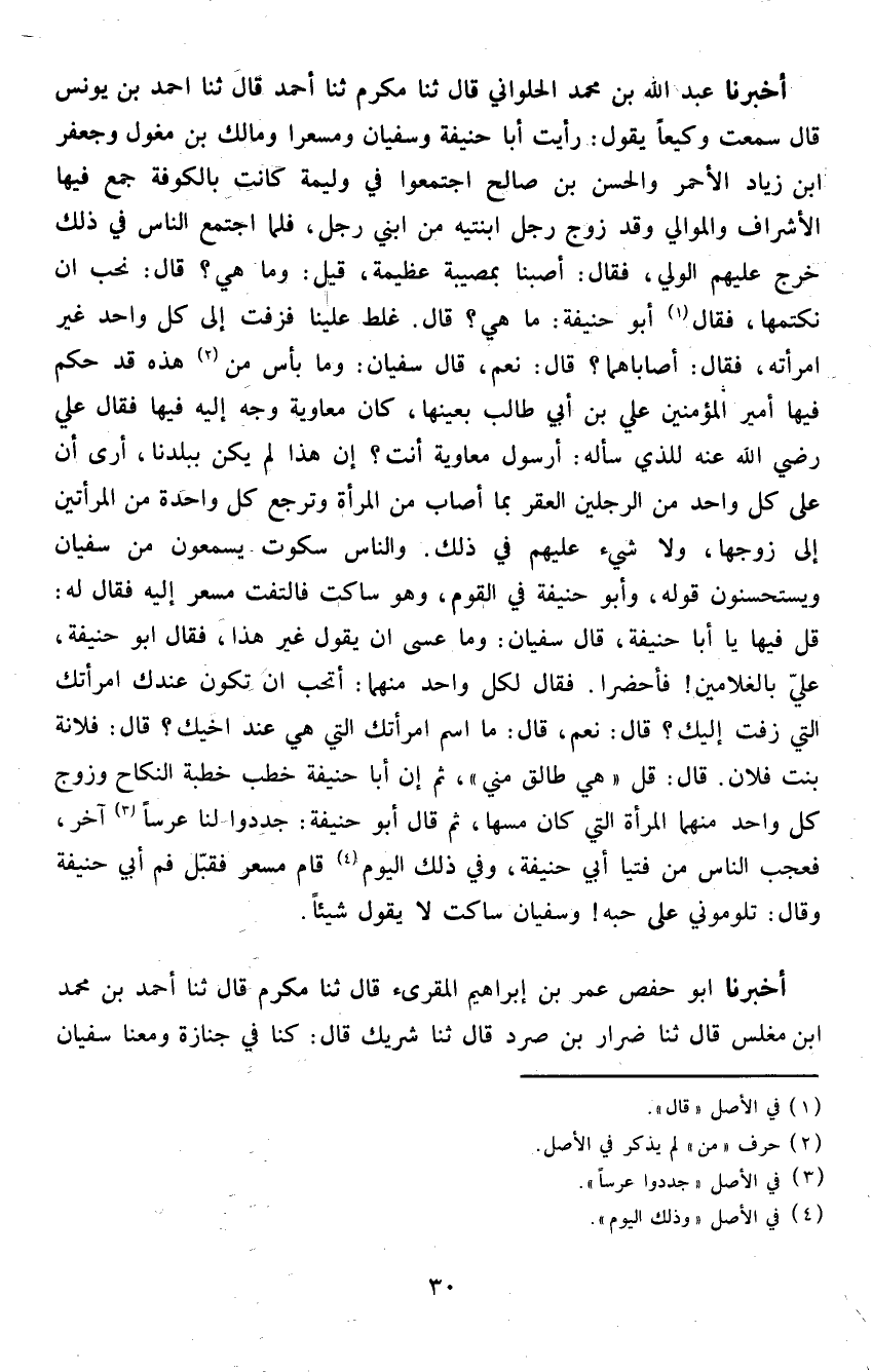 أخبرنَا عبد الله بن مُحَمَّد الْحلْوانِي قَالَ ثَنَا مكرم ثَنَا أَحْمد قَالَ ثَنَا احْمَد بن يُونُس قَالَ سَمِعت وكيعا يَقُول رَأَيْت أَبَا حنيفَة وسُفْيَان ومسعرا وَمَالك بن مغول وجعفر ابْن زِيَاد الْأَحْمَر وَالْحسن بن صَالح اجْتَمعُوا فِي وَلِيمَة كَانَت بِالْكُوفَةِ جمع فِيهَا الْأَشْرَاف والموالي وَقد زوج رجل ابْنَتَيْهِ من ابْني رجل فَلَمَّا اجْتمع النَّاس فِي ذَلِك خرج عَلَيْهِم الْوَلِيّ فَقَالَ أصبْنَا بمصيبة عَظِيمَة قيل وَمَا هِيَ قَالَ نحب ان نكتمها فَقَالَ أَبُو حنيفَة مَا هِيَ قَالَ غلط علينا فزفت إِلَى كل وَاحِد غير امْرَأَته فَقَالَ أصاباهما قَالَ نعم قَالَ سُفْيَان وَمَا بَأْس من هَذِه قد حكم فِيهَا أَمِير الْمُؤمنِينَ عَليّ بن أبي طَالب بِعَينهَا كَانَ مُعَاوِيَة وَجه إِلَيْهِ فِيهَا فَقَالَ عَليّ رَضِي الله عَنهُ للَّذي سَأَلَهُ أَرَسُول مُعَاوِيَة أَنْت إِن هَذَا لم يكن ببلدنا أرى أَن على كل وَاحِد من الرجلَيْن الْعقر بِمَا أصَاب من الْمَرْأَة وَترجع كل وَاحِدَة من الْمَرْأَتَيْنِ إِلَى زَوجهَا وَلَا شَيْء عَلَيْهِم فِي ذَلِك وَالنَّاس سكُوت يسمعُونَ من سُفْيَان ويستحسنون قَوْله وَأَبُو حنيفَة فِي الْقَوْم وَهُوَ سَاكِت فَالْتَفت مسعر إِلَيْهِ فَقَالَ لَهُ قل فِيهَا يَا أَبَا حنيفَة قَالَ سُفْيَان وَمَا عَسى ان يَقُول غير هَذَا فَقَالَ ابو حنيفَة عَليّ بالغلامين فأحضرا فَقَالَ لكل وَاحِد مِنْهُمَا أَتُحِبُّ أَن تكون عنْدك امْرَأَتك الَّتِي زفت إِلَيْك قَالَ نعم قَالَ مَا اسْم امْرَأَتك الَّتِي هِيَ عِنْد اخيك قَالَ فُلَانَة بنت فلَان قَالَ قل هِيَ طَالِق مني ثمَّ إِن أَبَا حنيفَة خطب خطْبَة النِّكَاح وَزوج كل وَاحِد مِنْهُمَا الْمَرْأَة الَّتِي كَانَ مَسهَا ثمَّ قَالَ أَبُو حنيفَة جددوا لنا عرسا آخر فَعجب النَّاس من فتيا أبي حنيفَة وَفِي ذَلِك الْيَوْم قَامَ مسعر فَقبل فَم أبي حنيفَة وَقَالَ تلوموني على حبه وسُفْيَان سَاكِت لَا يَقُول شَيْئا