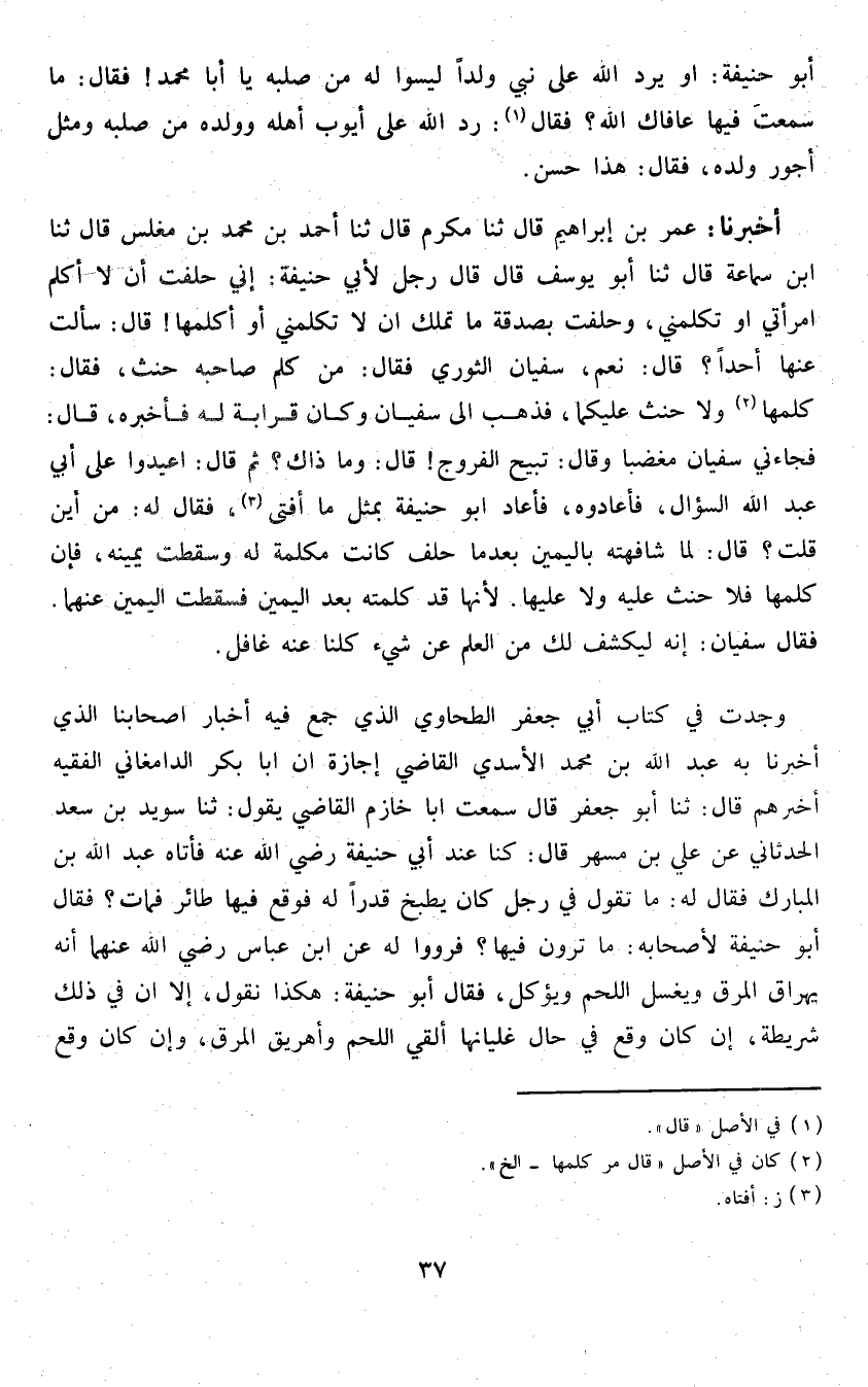وجدت فِي كتاب أبي جَعْفَر الطَّحَاوِيّ الَّذِي جمع فِيهِ أَخْبَار أَصْحَابنَا الَّذِي أخبرنَا بِهِ عبد الله بن مُحَمَّد الْأَسدي القَاضِي إجَازَة ان ابا بكر الدَّامغَانِي الْفَقِيه أخْبرهُم قَالَ ثَنَا أَبُو جَعْفَر قَالَ سَمِعت ابا خازم القَاضِي يَقُول ثَنَا سُوَيْد بن سعد الحدثاني عَن عَليّ بن مسْهر قَالَ كُنَّا عِنْد أبي حنيفَة رَضِي الله عَنهُ فَأَتَاهُ عبد الله بن الْمُبَارك فَقَالَ لَهُ مَا تَقول فِي رجل كَانَ يطْبخ قدرا لَهُ فَوَقع فِيهَا طَائِر فَمَاتَ فَقَالَ أَبُو حنيفَة لأَصْحَابه مَا ترَوْنَ فِيهَا فرووا لَهُ عَن ابْن عَبَّاس رَضِي الله عَنْهُمَا أَنه يهراق المرق وَيغسل اللَّحْم ويؤكل فَقَالَ أَبُو حنيفَة هَكَذَا نقُول إِلَّا ان فِي ذَلِك شريطة إِن كَانَ وَقع فِي حَال غليانها ألقِي اللَّحْم وَأُهْرِيقَ المرق وَإِن كَانَ وَقع