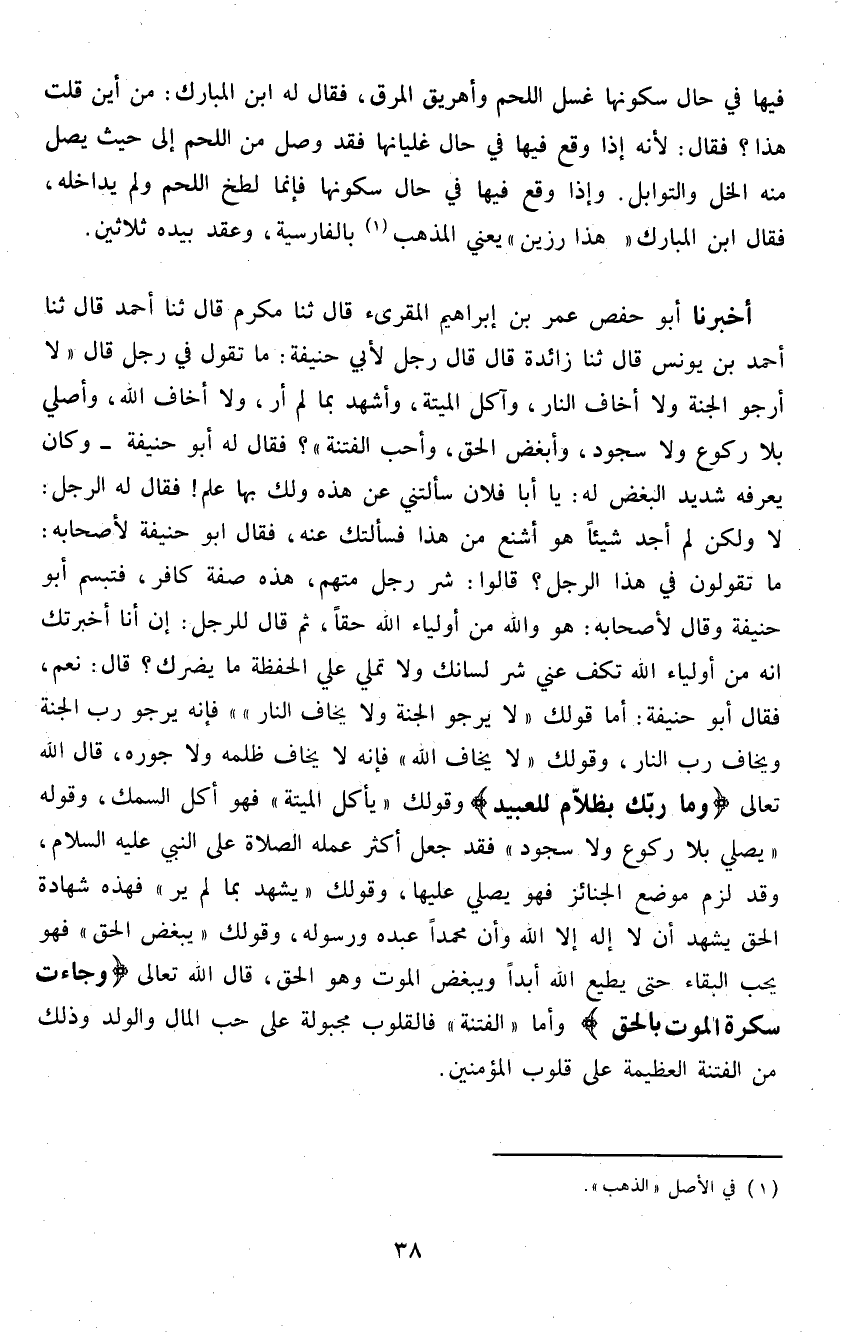 أخبرنَا أَبُو حَفْص عمر بن إِبْرَاهِيم المقرىء قَالَ ثَنَا أَحْمد قَالَ ثَنَا أَحْمد بن يُونُس قَالَ ثَنَا زَائِدَة قَالَ قَالَ رجل لأبي حنيفَة مَا تَقول فِي رجل قَالَ لَا أَرْجُو الْجنَّة وَلَا أَخَاف النَّار وآكل الْميتَة وَأشْهد بِمَا لم أر وَلَا أَخَاف الله وأصلي بِلَا رُكُوع ولاسجود وَأبْغض الْحق وَأحب الْفِتْنَة فَقَالَ لَهُ أَبُو حنيفَة وَكَانَ يعرفهُ شَدِيد البغض لَهُ يَا أَبَا فلَان سَأَلتنِي عَن هَذِه وَلَك بهَا علم فَقَالَ لَهُ الرجل لَا وَلَكِن لم أجد شَيْئا هُوَ أشنع من هَذَا فسألتك عَنهُ فَقَالَ ابو حنيفَة لأَصْحَابه مَا تَقولُونَ فِي هَذَا الرجل قَالُوا شَرّ رجل مُتَّهم هَذِه صفة كَافِر فَتَبَسَّمَ أَبُو حنيفَة وَقَالَ لأَصْحَابه هُوَ وَالله من أَوْلِيَاء الله حَقًا ثمَّ قَالَ للرجل إِن أَنا أَخْبَرتك انه من أَوْلِيَاء الله تكف عني شَرّ لسَانك وَلَا تملي عَليّ الْحفظَة مَا يَضرك قَالَ نعم فَقَالَ أَبُو حنيفَة أما قَوْلك لَا يَرْجُو الْجنَّة وَلَا يخَاف النَّار فَإِن يَرْجُو رب الْجنَّة وَيخَاف رب النَّار وقولك لَا يخَاف الله فَإِنَّهُ لَا يخَاف ظلمه وَلَا جوره فَقَالَ الله تَعَالَى {وَمَا رَبك بظلام للعبيد} وقولك يَأْكُل الْميتَة فَهُوَ أكل السّمك وَقَوله يُصَلِّي بِلَا رُكُوع وَلَا سُجُود فقد جعل أَكثر عمله الصَّلَاة على النَّبِي عَلَيْهِ السَّلَام وَقد لزم مَوضِع الْجَنَائِز فَهُوَ يُصَلِّي عَلَيْهَا وقولك يشْهد بِمَا لم ير فَهَذِهِ شَهَادَة الْحق يشْهد أَن لَا إِلَه إِلَّا الله وَأَن مُحَمَّدًا عَبده وَرَسُوله وقولك يبغض الْحق فَهُوَ يحب الْبَقَاء حَتَّى يُطِيع الله أبدا وَيبغض الْمَوْت وَهُوَ الْحق قَالَ تَعَالَى {وَجَاءَت سكرة الْمَوْت بِالْحَقِّ} واما الْفِتْنَة فالقلوب مجبولة على حب المَال وَالْولد وَذَلِكَ من الْفِتْنَة الْعَظِيمَة على قُلُوب الْمُؤمنِينَ