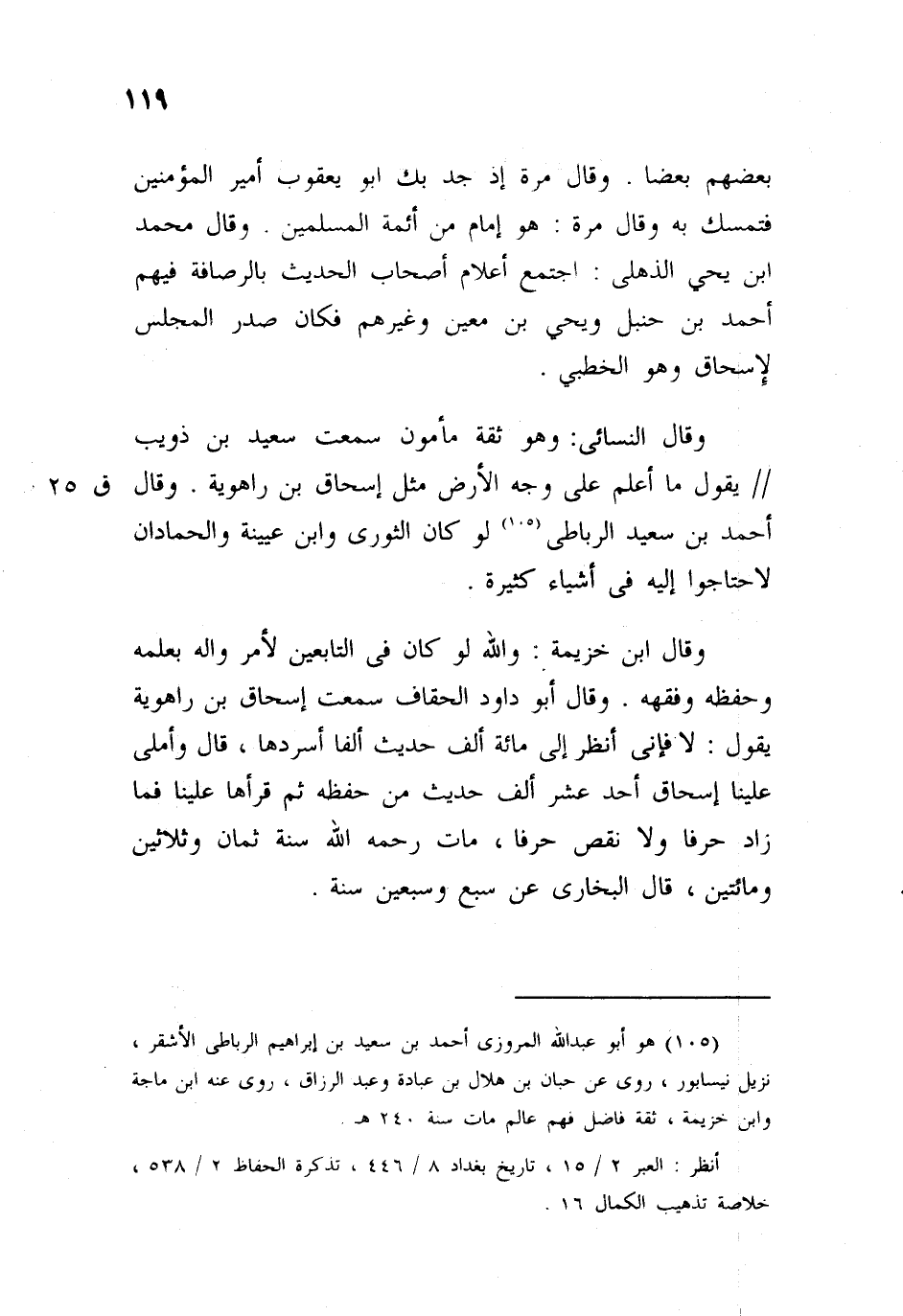 وقال النسائي: وهو ثقة مأمون سمعت سعيد بن ذؤيب، يقول: ما أعلم على وجه الأرض، مثل إسحاق بن راهويه، وقال أحمد بن سعيد الرباطي: لو كان الثوري، وابن عيينة، والحمادان، لاحتاجوا إليه في أشياء كثيرة.