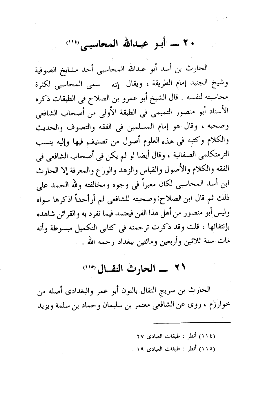 أحد مشايخ الصوفية، وشيخ الجنيد إمام الطريقة، ويقال: إنه إنما سمي المحاسبي لكثرة محاسبته نفسه، قال الشيخ أبو عمرو بن الصلاح، في الطبقات: ذكره الأسناد أبو منصور التميمي في الطبقة الأولى من أصحاب الشافعي وصحبه، وقال: هو إمام المسلمين في الفقه والتصوف، والحديث والكلام، وكتبه في هذه العلوم أصول من يصنف فيها، وإليه ينسب أكثر متكلمي الصفاتية، وقال أيضا: لو لم يكن في أصحاب الشافعي في الفقه، والكلام، والأصول، والقياس، والزهد، والورع، والمعرفة، إلا الحارث بن أسد المحاسبي لكان مغبرا في وجوه مخالفيه، والحمد لله على ذلك، ثم قال ابن الصلاح: وصحبته للشافعي