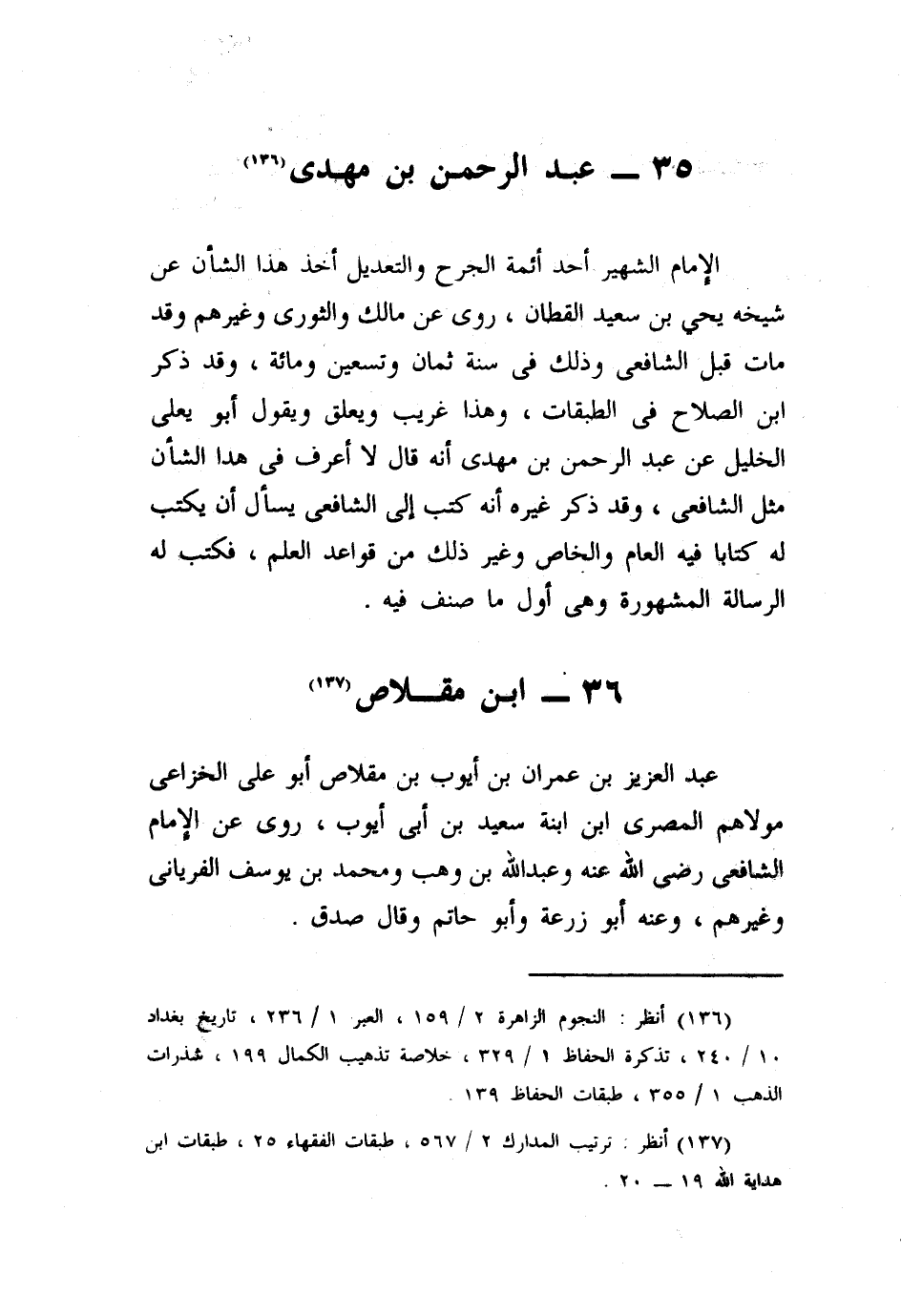 الإمام الشهير أحد أئمة الجرح والتعديل، أخذ هذا الشأن عن شيخه يحيى بن سعيد القطان، روى عن مالك، والثوري، وغيرهم، وقد مات قبل الشافعي، وذلك في سنة ثمان وتسعين ومائة، وقد ذكره ابن الصلاح في الطبقات، وهذا غريب وتعلق بقول أبي يعلى الخليلي، عن عبد الرحمن بن مهدي، أنه قال: لا أعرف في هذا الشأن مثل الشافعي، وقد ذكر غيره أنه كتب إلى الشافعي يسأله أن يكتب له كتابا فيه العام والخاص، وغير ذلك من قواعد العلم، فكتب له الرسالة المشهورة في أصول الفقه، وهي أول ما صنف فيه.