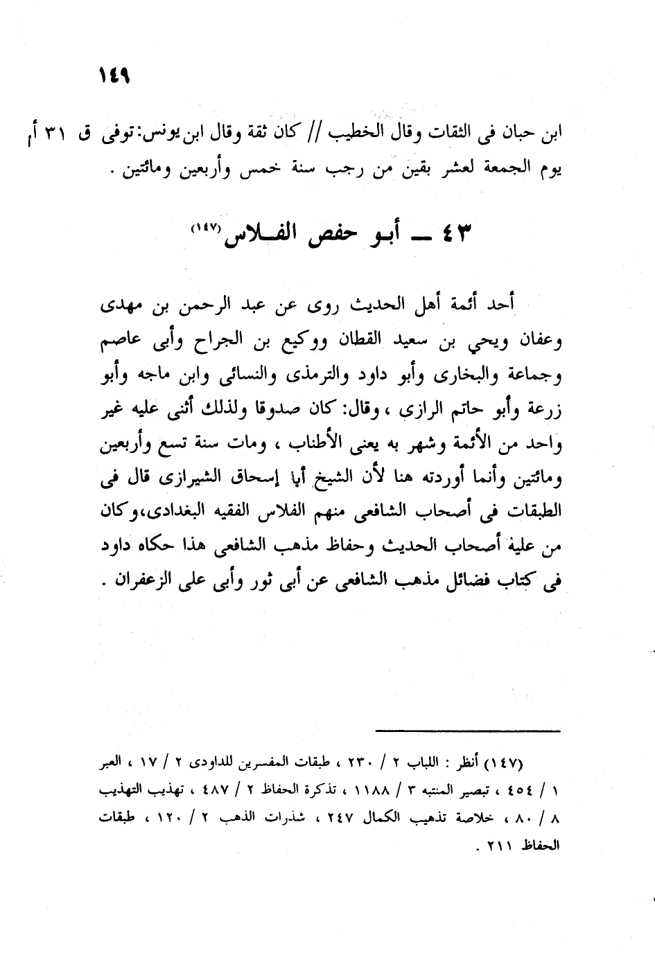 أحد أئمة أهل الحديث، روى عن عبد الرحمن بن مهدي، وعفان، ويحيى بن سعيد القطان، ووكيع بن الجراح، وأبي عاصم، وجماعة، وعنه: البخاري، ومسلم، وأبو داود، والترمذي، والنسائي، وابن ماجه، وأبو زرعة، وأبو حاتم الرازي، وقال: كان صدوقا في ذكره، أثنى عليه غير واحد من الأئمة، وشهرته تغني عن الإطناب في ذكره، ومات سنة تسع وأربعين ومائتين، وإنما أوردته هنا؛ لأن الشيخ أبا إسحاق، قال في الطبقات في أصحاب الشافعي: ومنه الفلاس الفقيه البغدادي، وكان من عِلْيَةِ أصحاب الحديث، وحفاظ ومذهب الشافعي، هكذا حكاه داود في كتاب فضائل مذهب الشافعي، عن أبي ثور، وأبي علي