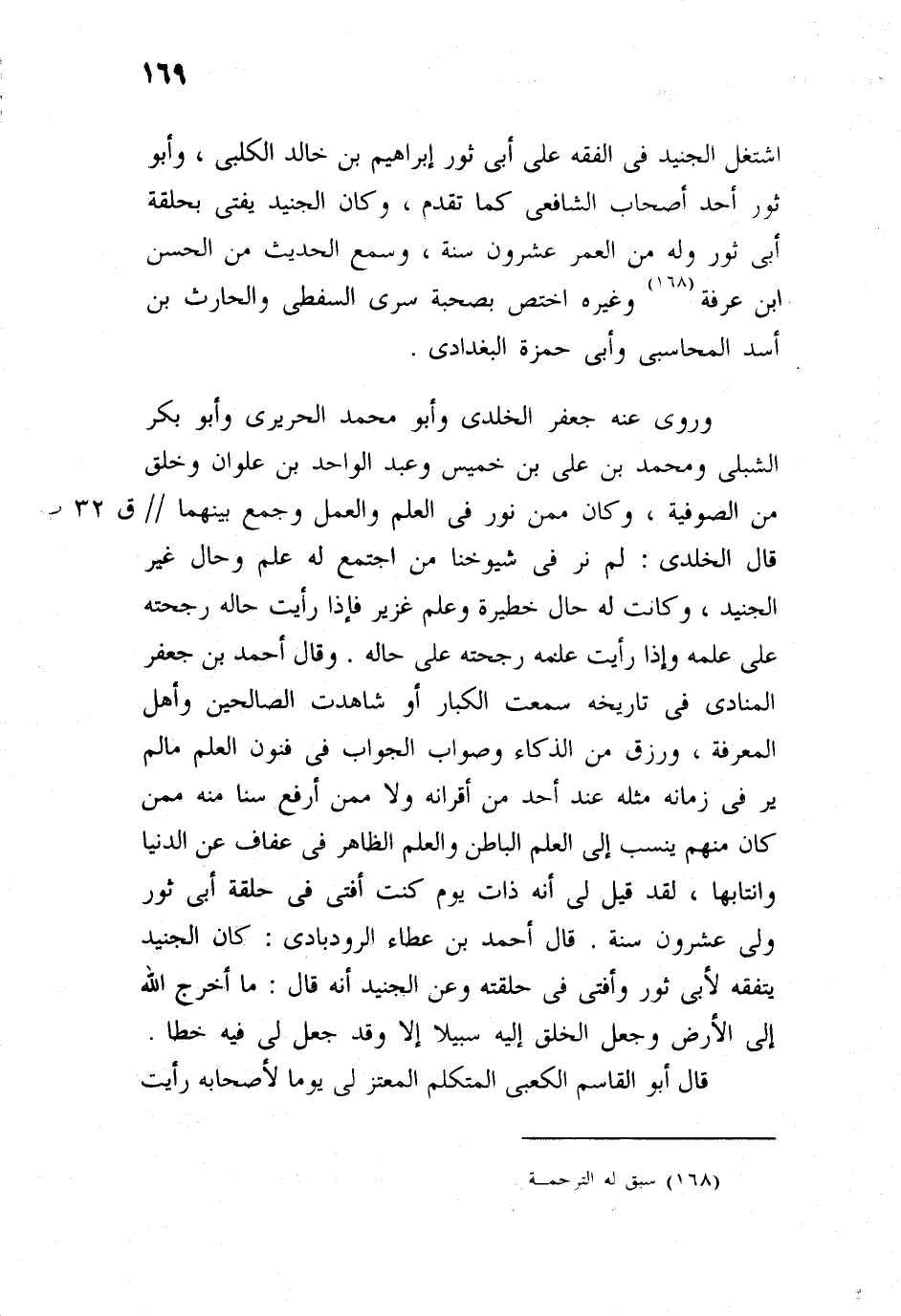 تعالى، اشتغل الجنيد، رحمه الله، في الفقه على أبي ثور إبراهيم بن خالد الكلبي، وأبو ثور: أحد أصحاب الشافعي، كما تقدم، وكان الجنيد يفتي بحلقة أبي ثور، وله من العمر عشرون سنة، وسمع الحديث من الحسن بن عرفة، وغيره، واختص بصحبة سري السقطي، والحارث بن أسد المحاسبي، وأبي حمزة البغدادي.