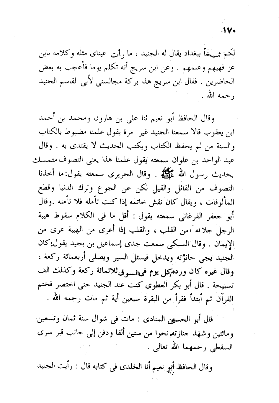 سمعته، يقول: أقل ما في الكلام، سقوط هيبة الرب، جل جلاله، من القلب، والقلب إذا عرى من الهيبة، عرى من الإيمان، وقال السلمي: سمعت جدي إسماعيل بن نجيد، يقول: كان الجنيد يجيء فيفتح حانوته، ويدخل فيسبل الستر، ويصلي أربع مائة ركعة، وقال غيره: كان ورده كل يوم في سوقه ثلاث مائة ركعة، وكذا وكذا ألف تسبيحة، قال أبو بكر العطوي: كنت عند الجنيد حين احتضر فختم القرآن، ثم ابتدأ فقرأ من البقرة سبعين آية ثم مات، رحمه الله، قال أبو الحسين ابن المنادي: مات في شوال سنة ثمان وتسعين ومائتين، وشهد جنازته نحوا من ستين ألفا، ودفن إلى جانب قبر سري السقطي، رحمهما الله