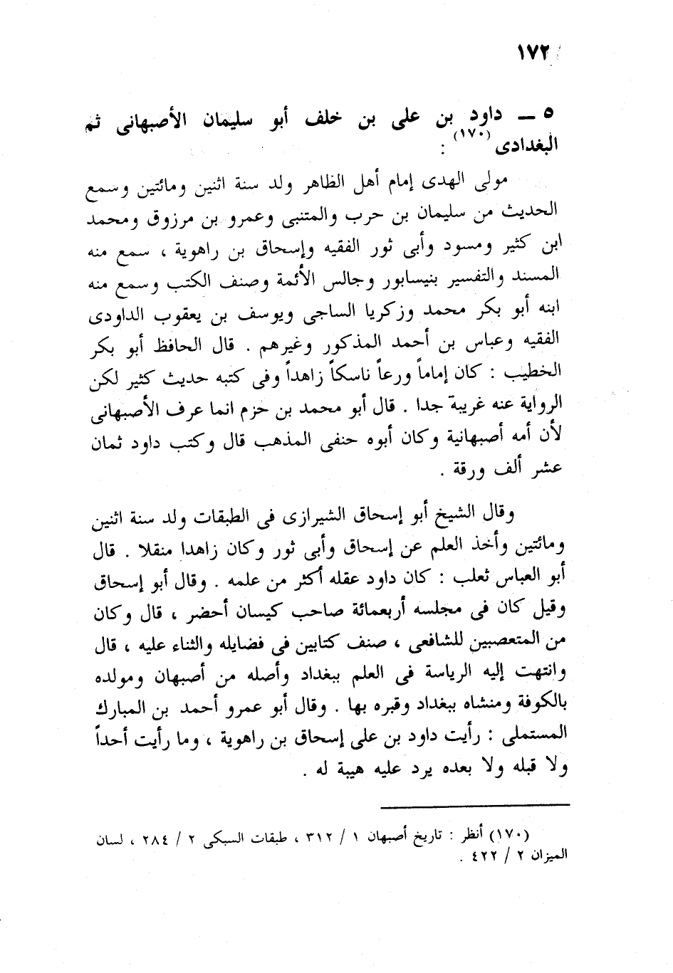 مولى المهدي، إمام أهل الظاهر، ولد سنة اثنتين ومائتين، وسمع الحديث من سليمان بن حرب، والقعنبي، وعمرو بن مرزوق، ومحمد بن كثير العبدي، ومسدد، وأبي ثور الفقيه، وإسحاق بن راهويه، سمع منه المسند، والتفسير بنيسابور، وجالس الأئمة وصنف الكتب، وسمع منه: ابنه أبو بكر محمد، وزكريا الساجي، ويوسف بن يعقوب الداودي الفقيه، وعباس بن أحمد المذكر، وغيرهم، قال الحافظ أبو بكر الخطيب: كان إماما ورعا ناسكا زاهدا، وفي كتبه حديث كثير، لكن الرواية عنه عزيزة جدا، قال أبو محمد بن حزم: إنما عرف بالأصبهاني، لأن أمه أصبهانية، وكان أبوه حنفي المذهب، قال: وكتب داود ثماني عشرة