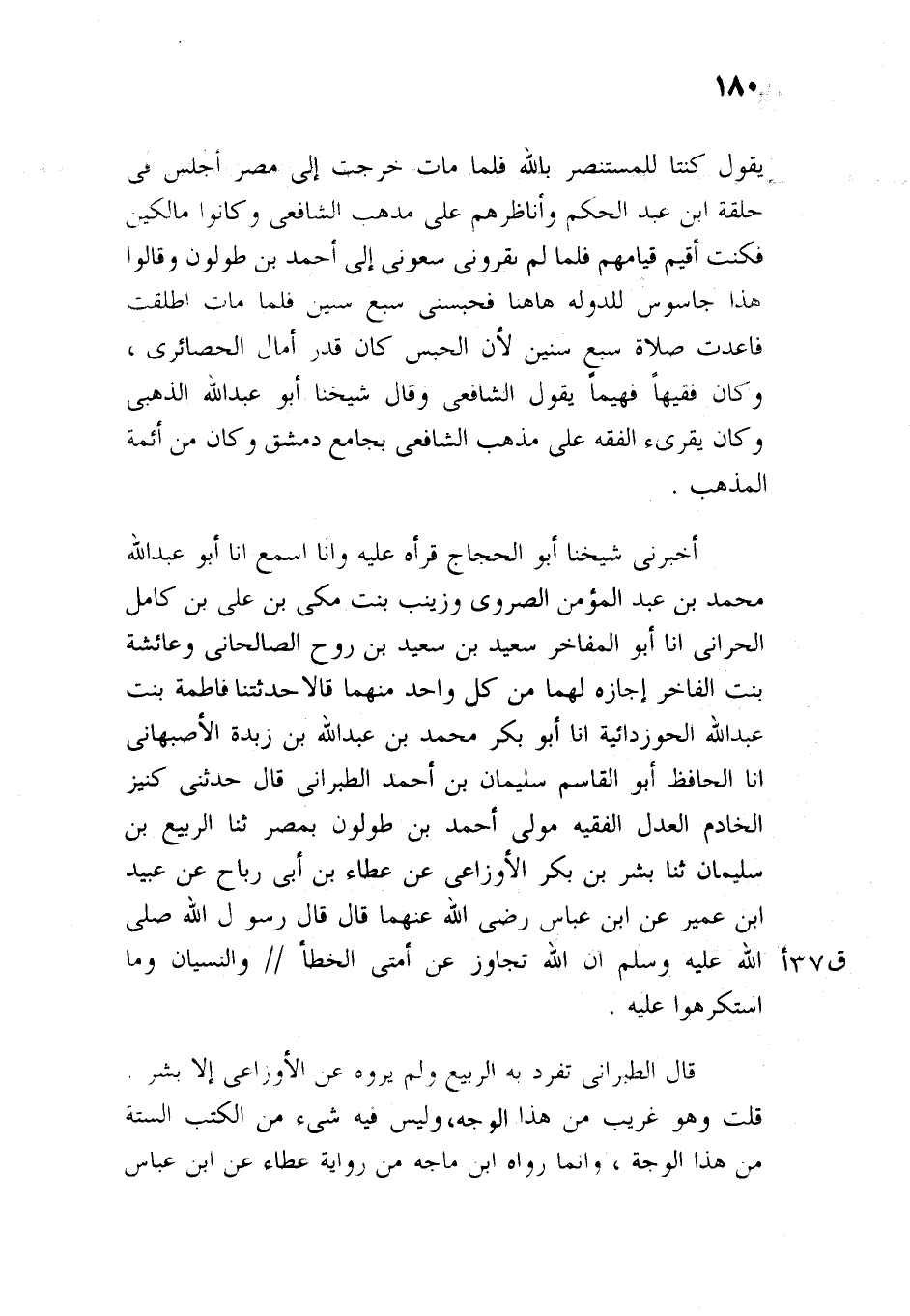 الْحَافِظُ أَبُو الْقَاسِمِ سُلَيْمَانُ بْنُ أَحْمَدَ الطَّبَرَانِيُّ، قَالَ: حَدَّثَنِي كَنِيزٌ الْخَادِمُ الْعَدْلُ الْفَقِيهُ، مَوْلَى أَحْمَدَ بْنِ طُولُونَ، بِمِصْرَ، ثنا الرَّبِيعُ بْنُ سُلَيْمَانَ، ثنا بِشْرُ بْنُ بَكْرٍ، عَنِ الأَوْزَاعِيِّ، عَنْ عَطَاءِ بْنِ أَبِي رَبَاحٍ، عَنْ عُبَيْدِ بْنِ عُمَيْرٍ، عَنِ ابْنِ عَبَّاسٍ، رَضِيَ اللَّهُ عَنْهُمَا، قَالَ: قَالَ رَسُولُ اللَّهِ، صَلَّى اللَّهُ عَلَيْهِ وَسَلَّمَ: «إِنَّ اللَّهَ تَجَاوَزَ عَنْ أُمَّتِي الْخَطَأَ وَالنِّسْيَانَ وَمَا اسْتُكْرِهُوا عَلَيْهِ» ، قال الطبراني: تفرد به الربيع،