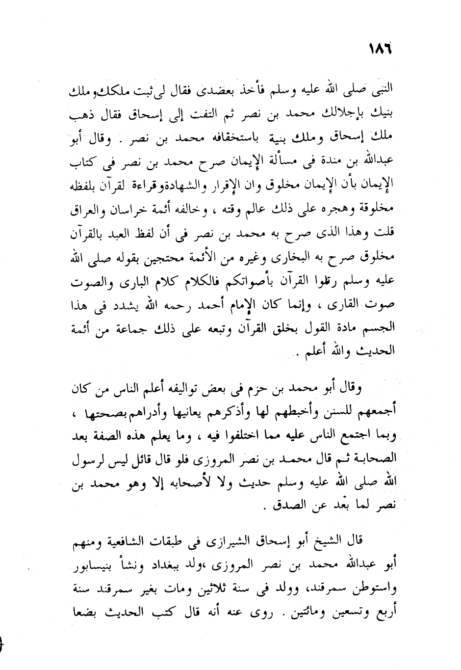 النبي، صلى الله عليه وسلم، فأخذ بعضدي، فقال لي: ثبت ملكك، وملك بنيك، بإجلالك لمحمد بن نصر، ثم التفت إلى إسحاق، فقال: ذهب ملك إسحاق، وملك بنيه، باستخفافه بمحمد بن نصر، وقال أبو عبد الله بن منده في مسألة الإيمان: صرح محمد بن نصر في كتاب الإيمان بأن الإيمان مخلوق، وأن الإقرار، والشهادة، وقراءة القرآن بلفظه مخلوقة، وهجره على ذلك علماء وقته وخالفه أئمة خراسان، والعراق،