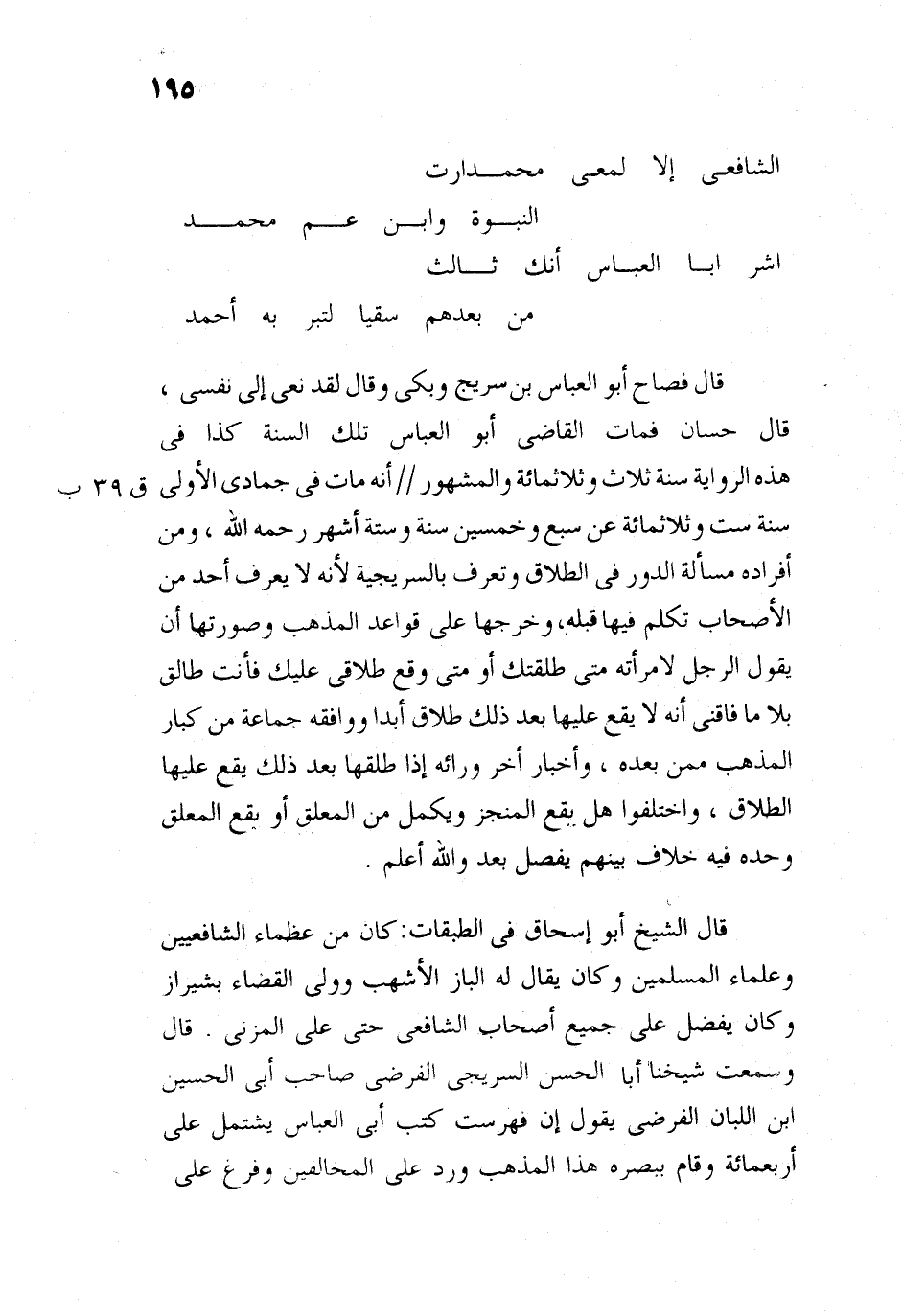 قال: فصاح أبو العباس سريج وبكى، وقال: نعى إلي نفسي، قال حسان: فمات القاضي أبو العباس تلك السنة، رحمه الله، كذا في هذه الرواية سنة ثلاث وثلاث مائة، والمشهور أنه مات في جمادى الأولى سنة ست وثلاث مائة عن سبع وخمسين سنة وستة أشهر، رحمه الله، ومن أفراده مسألة الدور في الطلاق، وتعرف بالسريجية، لأنه لا يعرف أحد من الأصحاب تكلم فيها قبله، وخَرَّجَهَا على قواعد المذهب وصورته، أن يقول الرجل لامرأته: متى طلقتك، أو متى وقع طلاقي عليك، فأنت طالق قبله ثلاثا، فأفتى أنه لا يقع عليها بعد ذلك طلاق أبدا، ووافقه جماعة من كبار المذهب ممن بعده، واختار آخرون أنه إذا