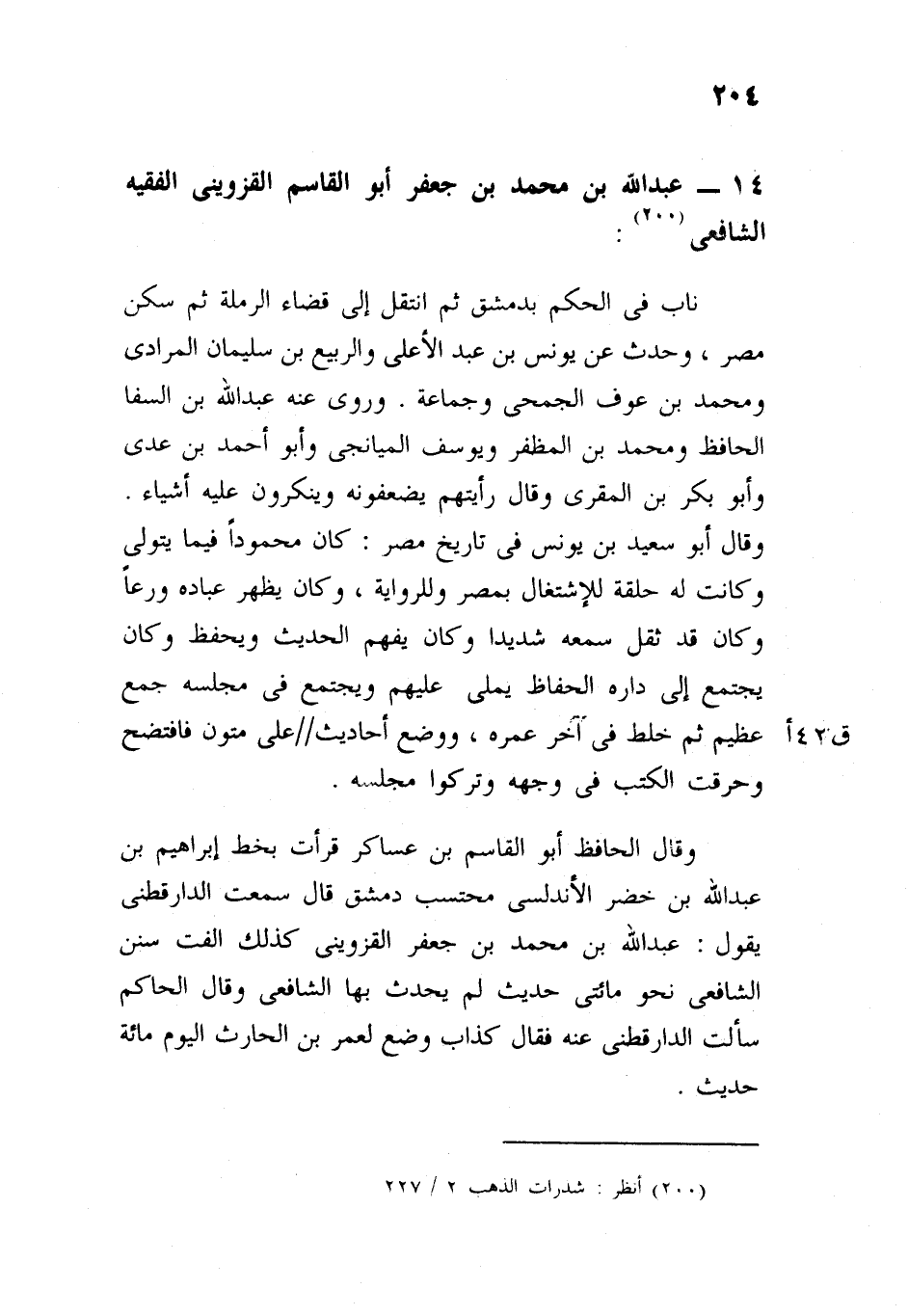 وقال الحافظ أبو القاسم ابن عساكر: قرأت بخط إبراهيم بن عبد الله بن خضر الأندلسي محتسب دمشق، قال: سمعت الدارقطني، يقول: عبد الله محمد بن جعفر القزويني كذاب، ألف سنن الشافعي، بنحو مائتي حديث لم يحدث بها الشافعي، وقال الحاكم: سألت الدارقطني عنه، فقال: كذاب وضع لعمرو بن الحارث، أكثر من مائة حديث، مات سنة أربع عشرة وثلاث مائة.