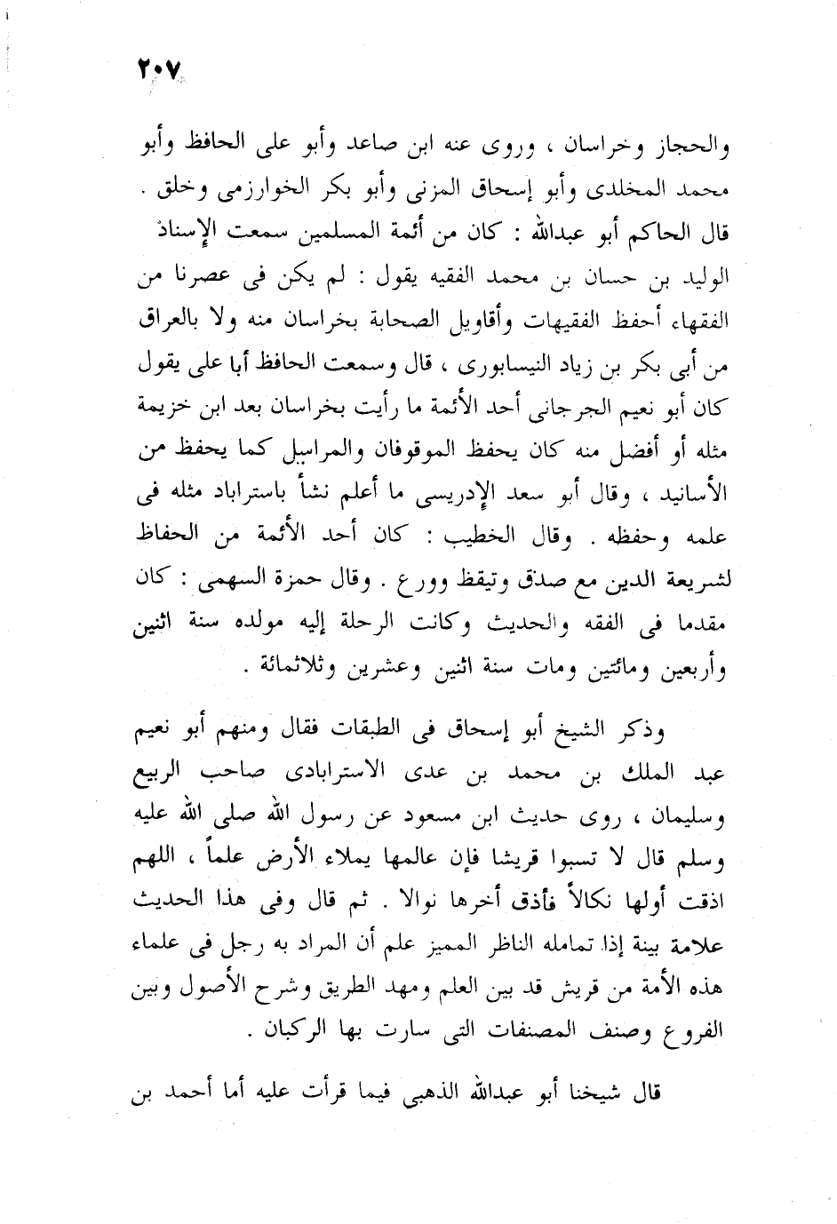 وذكره الشيخ أبو إسحاق في الطبقات، فقال: ومنهم: أبو نعيم عبد الملك بن محمد بن عدي الإستراباذي، صاحب الربيع، وسليمان، روى حديث ابن مسعود، عن رسول الله، صلى الله عليه وسلم، قال: «لا تسبوا قريشا، فإن عالمها يملأ الأرض علما، اللهم أذقت أولها نكالا، فأذق آخرها نوالا» ، ثم قال: وفي هذا الحديث علامة بينة إذا تأمله الناظر المميز، علم أن المراد به رجل من علماء هذه الأمة، من قريش يظهر علمه، وتلك صفة لا تصلح إلى للشافعي، رحمه الله، فإنه عالم من قريش، قد بين العلم، ومهد الطريق، وشرح الأصول، وبين الفروع، وصنف المصنفات التي سارت بها الركبان.