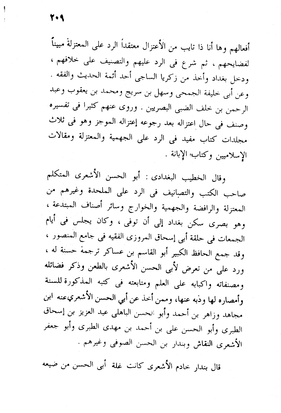 وقال الخطيب البغدادي: أبو الحسن الأشعري المتكلم صاحب الكتب والتصانيف، في الرد على الملحدة، وغيرهم من المعتزلة، والرافضة، والجهمية، والخوارج، وسائر أصناف المبتدعة، وهو بصري سكن بغداد إلى أن توفي بها، وكان يجلس في أيام الجمعات في حلقة أبي إسحاق المروزي الفقيه في جامع المنصور، وقد جمع الحافظ الكبير أبو القاسم ابن عساكر له ترجمة حسنة، ورد على من تعرض لأبي الحسن الأشعري بالطعن، وذكر فضائله، ومصنفاته، وإكبابه على العلم، ومتابعته في كتبه المذكورة للسنة، وانتصاره لها، وذبه عنها، وممن أخذ عن الشيخ أبي الحسن الأشعري: ابن مجاهد، وزاهر بن أحمد، وأبو الحسن