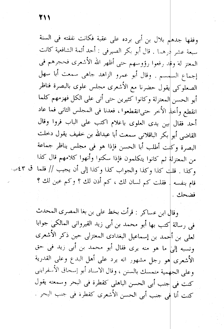 وقفها جدهم بلال بن أبي بردة على عقبه، وكانت نفقته في السنة سبعة عشر درهما، وقال أبو بكر الصيرفي، أحد أئمة الشافعية: كانت المعتزلة قد رفعوا رءوسهم، حتى أشهر الله الأشعري فحجرهم في أقماع السمسم، وقال أبو عمر الزردجاهي: سمعت أبا سهل الصعلوكي، يقول: حضرنا مع الأشعري مجلس علوي بالبصرة، فناظر أبو الحسن المعتزلة، وكانوا كثيرا حتى أتى على الكل فهزمهم، كلما انقطع واحد أخذ الآخر حتى انقطعوا، فعدنا في المجلس الثاني فما عاد أحد، فقال بين يدي العلوي: يا غلام اكتب على الباب، فَرُّوا، وقال القاضي أبو بكر