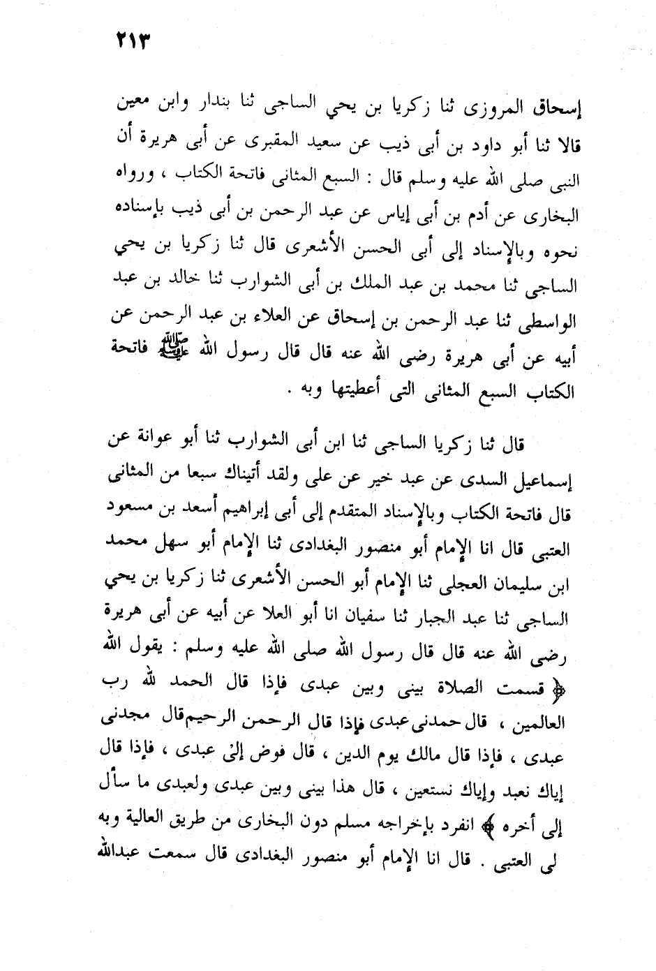 وَبِالإِسْنَادِ إِلَى أَبِي الْحَسَنِ الأَشْعَرِيِّ، قَالَ: ثنا زَكَرِيَّا بْنُ يَحْيَى السَّاجِيُّ، ثنا مُحَمَّدُ بْنُ عَبْدِ الْمَلِكِ بْنِ أَبِي الشَّوَارِبِ، ثنا خَالِدُ بْنُ عَبْدِ اللَّهِ الْوَاسِطِيُّ، ثنا عَبْدُ الرَّحْمَنِ بْنُ إِسْحَاقَ، عَنِ الْعَلاءِ بْنِ عَبْدِ الرَّحْمَنِ، عَنْ أَبِيهِ، عَنْ أَبِي هُرَيْرَةَ، رَضِيَ اللَّهُ عَنْهُ، قَالَ: قَالَ رَسُولُ اللَّهِ، صَلَّى اللَّهُ عَلَيْهِ وَسَلَّمَ: «فَاتِحَةُ الْكِتَابِ السَّبْعُ الْمَثَانِي الَّتِي أُعْطِيتُهَا»