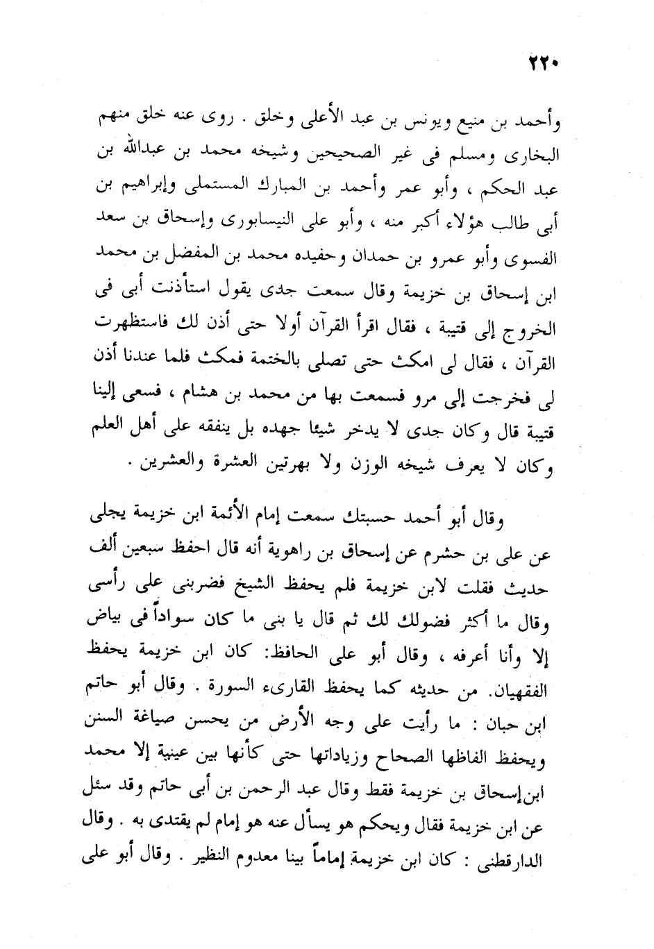 حمدان، وحفيده محمد بن المفضل بن محمد بن إسحاق بن خزيمة، وقال: سمعت جدي، يقول: استأذنت أبي في الخروج إلى قتيبة، فقال: اقرأ القرآن أولا، حتى آذن لك فاستظهرت القرآن، فقال: امكث حتى تصلي بالختمة، فمكثت، فلما عدنا أذن لي، فخرجت إلى مرو، فسمعت بها من محمد بن هشام، فنعى إلينا قتيبة، قال: وكان جدي لا يدخر شيئا جهده، بل ينفقه على أهل العلم، وكان لا يعرف الوزن ولا يميز بين العشرة والعشرين.