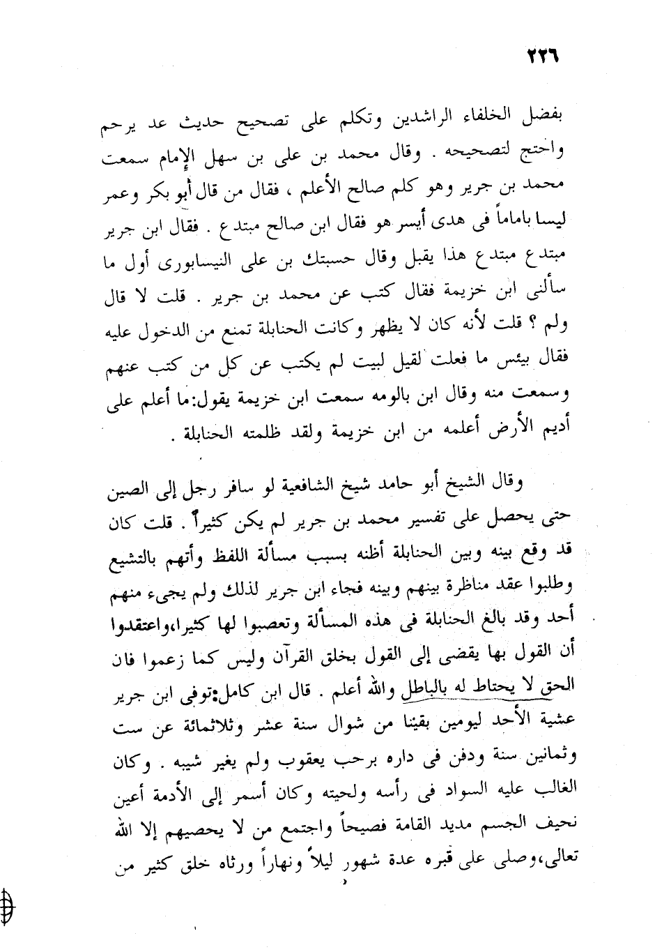 أعلم من ابن جرير، ولقد ظلمته الحنابلة، وقال الشيخ أبو حامد شيخ الشافعية: لو سافر رجل إلى الصين حتى يحصل تفسير محمد بن جرير، لم يكن كثيرا، قلت: كان قد وقع بينه وبين الحنابلة، أظنه بسبب مسألة اللفظ، واتهم بالتشيع وطلبوا عقد مناظرة بينهم وبينه، فجاء ابن جرير، رحمه الله، لذلك، ولم يجئ منهم أحد، وقد بالغ الحنابلة في هذه المسألة، وتعصبوا لها كثيرا، واعتقدوا أن القول بها يقضي إلى القول بخلق القرآن، وليس كما زعموا، فإن الحق لا يحتاط بالباطل، والله أعلم، قال ابن كامل: توفي ابن جرير رحمه الله عشية الأحد ليومين بقيا من شوال سنة عشر وثلاث مائة عن ست