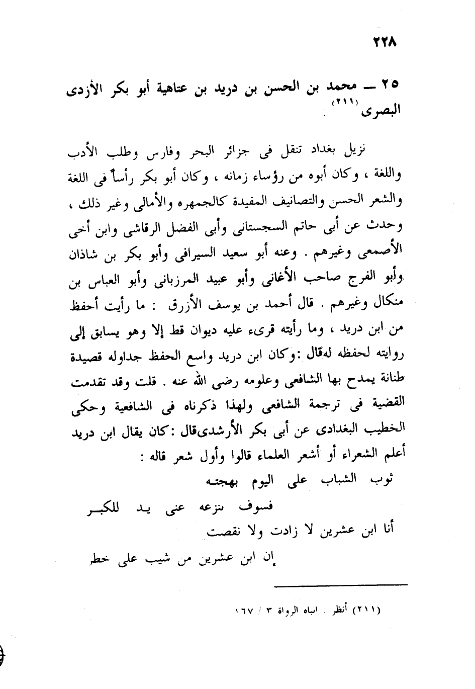 نزيل بغداد، تنقل في جزائر البحر، وفارس، وطلب الأدب واللغة، وكان أبوه من رؤساء زمانه، وكان أبو بكر رأسا في اللغة والشعر، وله الشعر الحسن، والتصانيف المفيدة، كالجمهرة، والأمالي، وغير ذلك، وحدث عن أبي حاتم السجستاني، وأبي الفضل الرقاشي، وابن أخي الأصمعي، وغيرهم، وعنه: أبو سعيد السيرافي، وأبو بكر بن شاذان، وأبو الفرج صاحب الأغاني، وأبو عبيد الله المرزباني، وأبو العباس إسماعيل بن ميكال، وغيرهم، قال أحمد بن يوسف الأزرق: ما رأيت أحفظ من ابن دريد، وما رأيته قرئ عليه ديوان قط، إلا وهو يسابق إلى روايته لحفظه له، قال: وكان ابن دريد واسع الحفظ جدا، وله