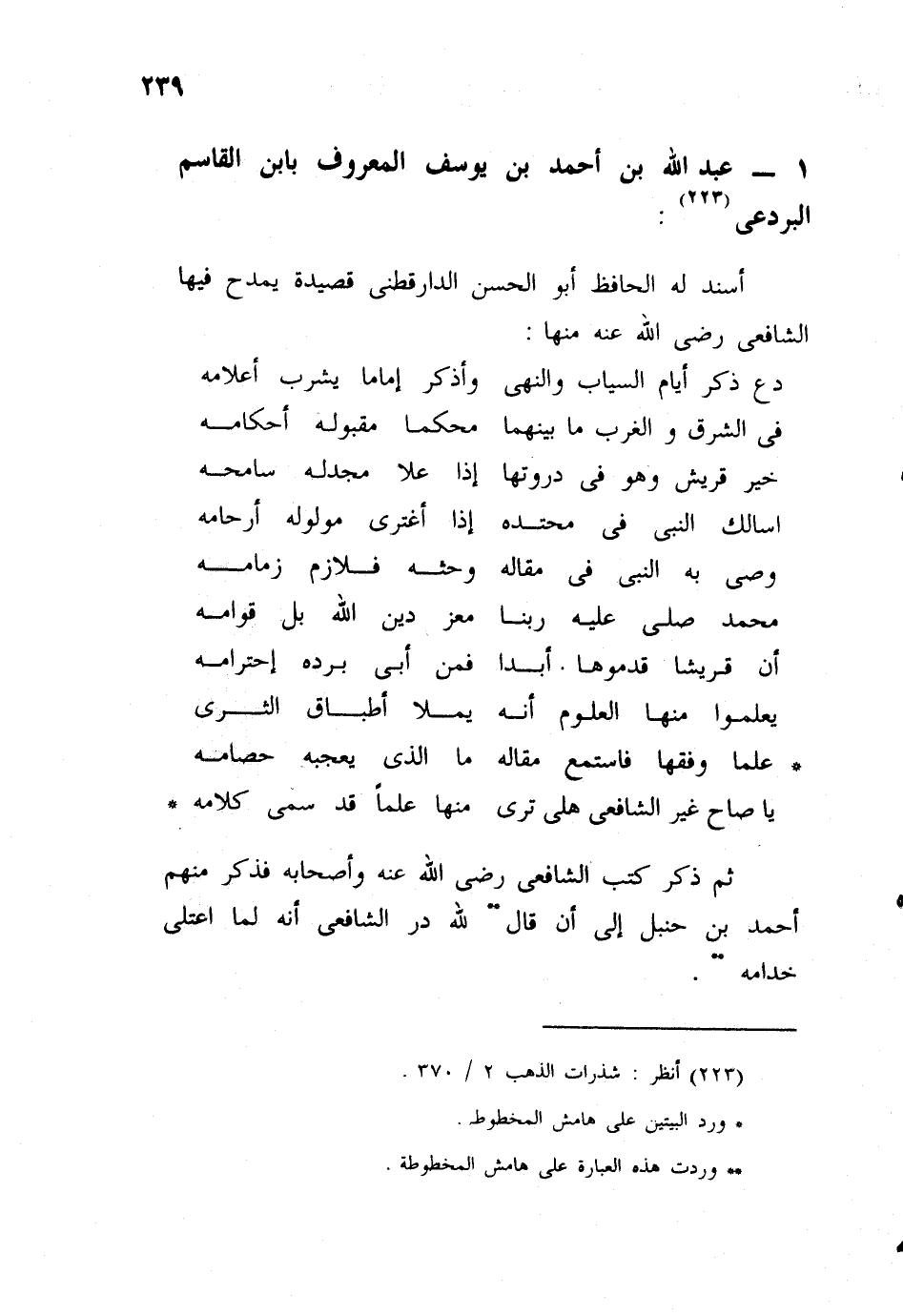 أسند له الحافظ أبو الحسن الدارقطني قصيدة يمدح فيها الإمام الشافعي، رضي الله عنه، منها: