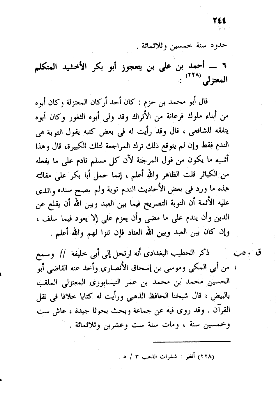 قال أبو محمد بن حزم: كان أحد أركان المعتزلة، وكان أبوه من أبناء ملوك فرغانة من الأتراك، وقد ولي أبوه الثغور، وكان أبو بكر يتفقه للشافعي، قال: وقد رأيت له في بعض كتبه، يقول: التوبة هي الندم فقط، وإن لم ينو مع ذلك ترك المراجعة لتلك الكبيرة، قال: وهذا أشنع ما يكون من قول المرجئة، لأن كل مسلم نادم على ما يفعله من الكبائر، قلت: الظاهر، والله أعلم، إنما حمل أبا بكر على مقالته هذه ما ورد في بعض الأحاديث: الندم توبة، ولم يصح سنده، والذي عليه الأئمة أن التوبة النصوح فيما بين العبد وبين الله تعالى، أن يقلع عن الذنب وأن يندم على ما مضى، وأن يعزم على ألا