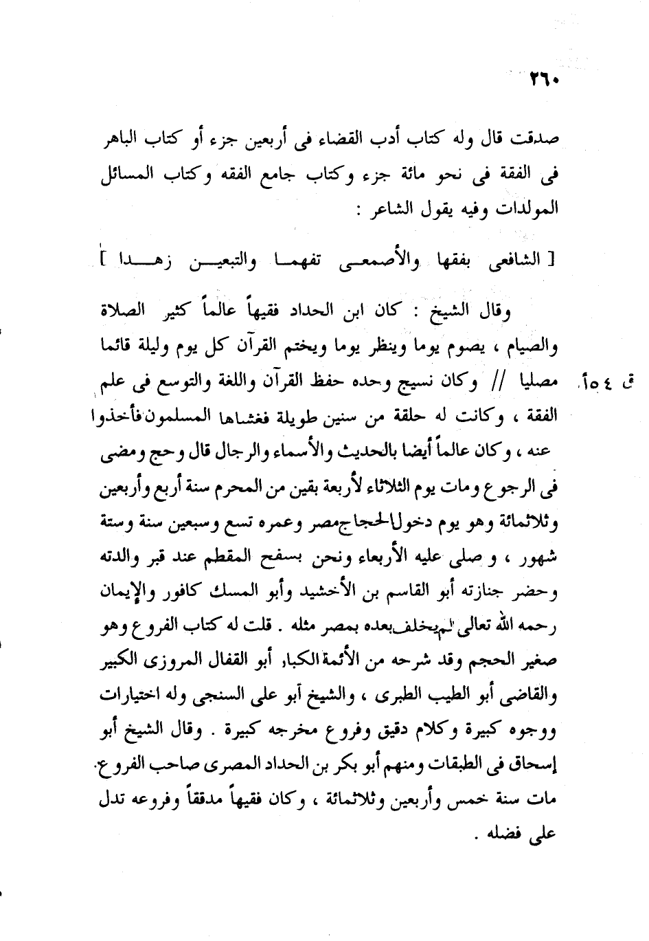 الإخشيد، وأبو المسك كافور، والأعيان، رحمه الله، فما خلف بعده بمصر مثله، قلت: له كتاب الفروع، وهو صغير الحجم، وقد شرحه من الأئمة الكبار: أبو بكر القفال المروزي الكبير، والقاضي أبو الطيب الطبري، والشيخ أبو علي السنجي، وله اختيارات، ووجوه كثيرة، وكلام دقيق، وفروع مخرجه كثيرة، وقال الشيخ أبو إسحاق في الطبقات: ومنهم: ابن أبي بكر بن الحداد المصري صاحب الفروع، مات سنة خمس وأربعين وثلاث مائة، وكان فقيها مدققا، وفروعه تدل على فضله.
