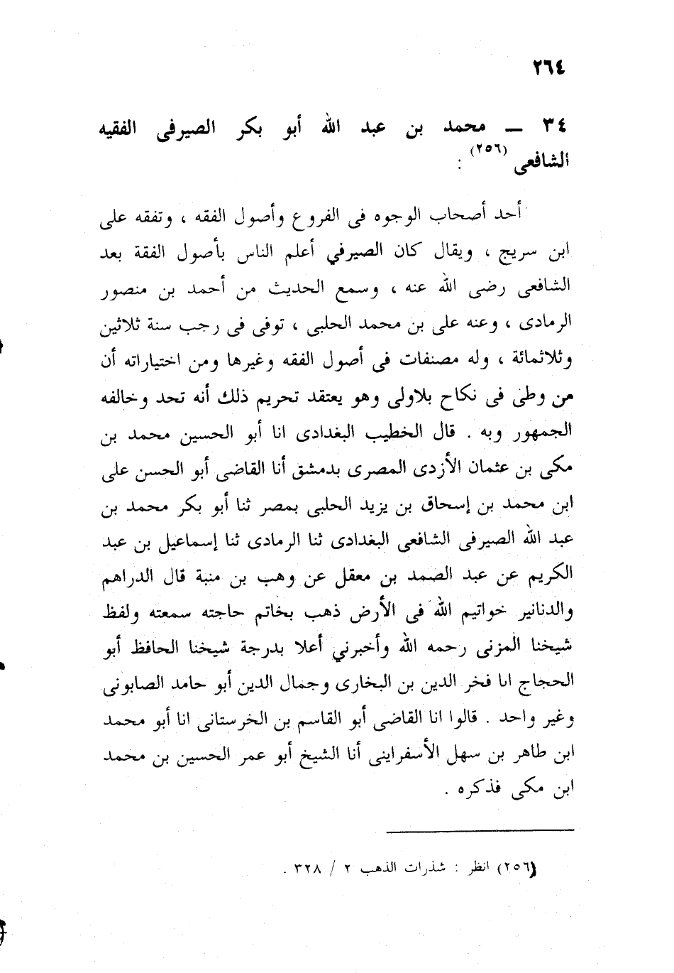 أحد أصحاب الوجوه في الفروع وأصول الفقه، وتفقه على ابن سريج، ويقال: كان الصيرفي أعلم الناس بأصول الفقه بعد الشافعي، رضي الله عنه، وسمع الحديث من أحمد بن منصور الرمادي، وعنه: علي بن محمد الحلبي، توفي في رجب سنة ثلاثين وثلاث مائة، قال الخطيب: ولم يرو كثير شيء، وقال الشيخ أبو إسحاق الشيرازي: ومنهم: أبو بكر محمد بن عبد الله الصيرفي، مات سنة ثلاثين وثلاث مائة، وله مصنفات في أصول الفقه وغيرها، ومن اختياراته: أن من وطئ في نكاح بلا ولي، وهو يعتقد تحريم ذلك يحد، وخالفه الجمهور، وبه قال الخطيب البغدادي: أنا أبو الحسين محمد بن مكي بن عثمان الأزدي المصري