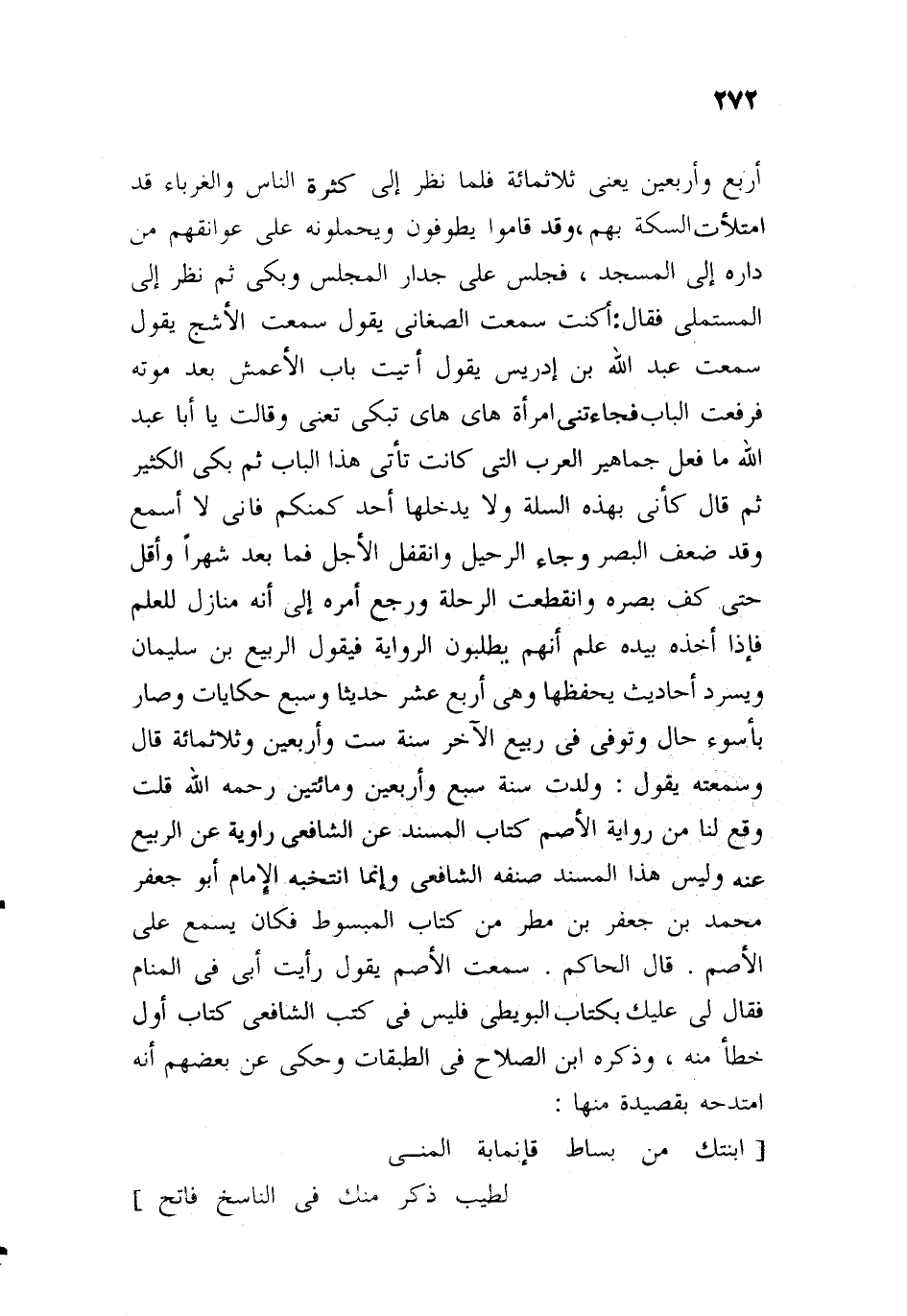يطلبون الرواية، فيقول: حدثنا الربيع بن سليمان، ويسرد أحاديث يحفظها، وهي أربعة عشر حديثا، وسبع حكايات، وصار بأسوأ حال، وتوفي في ربيع الآخر سنة ست وأربعين وثلاث مائة، قال: وسمعته، يقول: ولدت سنة سبع وأربعين ومائتين، رحمه الله، قلت: وقع لنا من رواية الأصم كتاب المسند عن الشافعي، يرويه عن الربيع عنه، وليس هذا المسند صنعه الشافعي، وإنما انتخبه الإمام أبو جعفر محمد بن جعفر بن مطر من كتب المبسوط، فكان يسمع على الأصم، قال الحاكم: سمعت الأصم، يقول: رأيت أبي في المنام، فقال لي: عليك بكتاب البويطي، فليس في كتب الشافعي كتاب أقل خطأ منه، وذكره ابن الصلاح