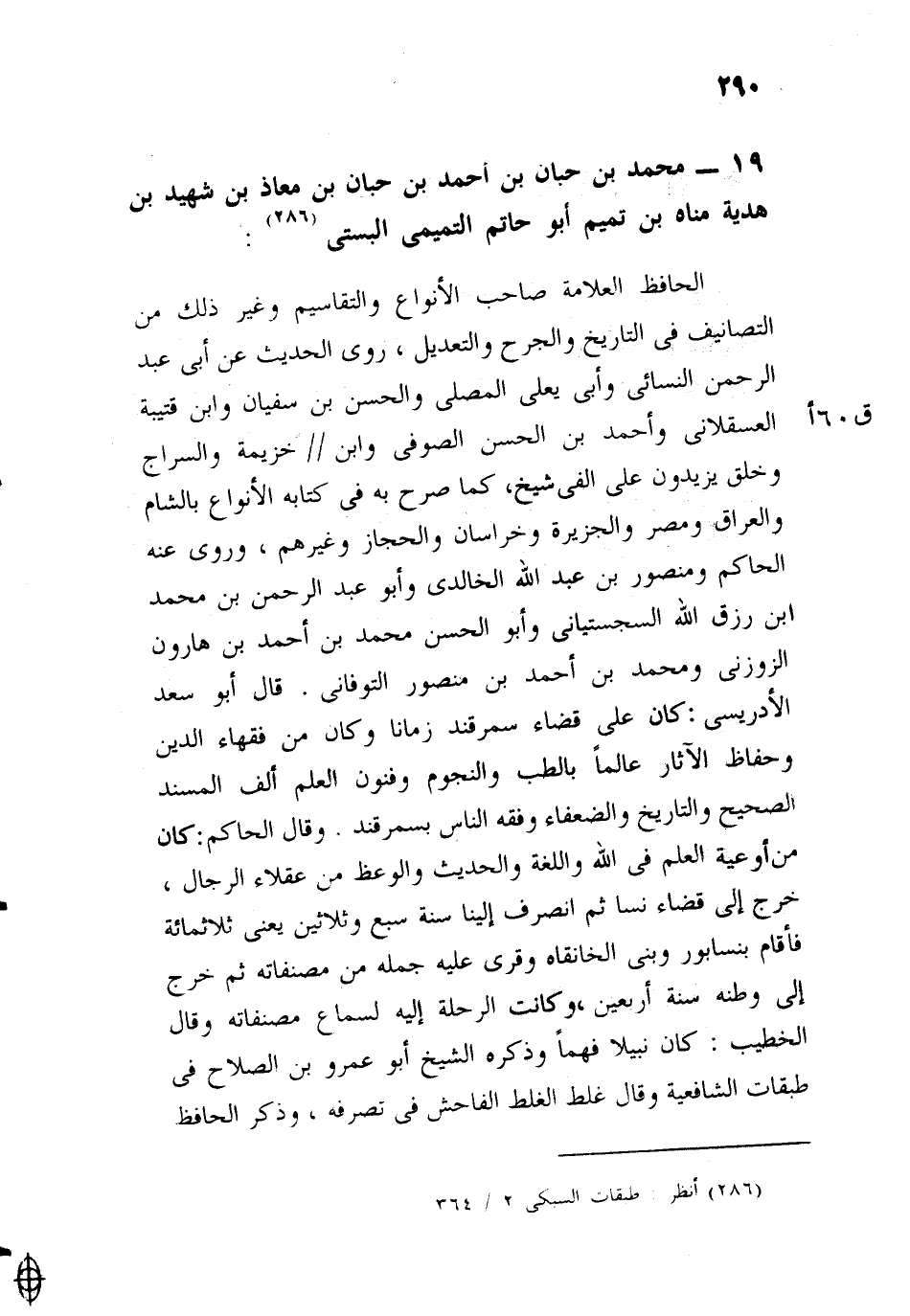 الحافظ العلامة، صاحب الأنواع والتقاسيم، وغير ذلك من التصانيف في التاريخ، والجرح والتعديل، روى الحديث عن أبي عبد الرحمن النسائي، وأبي يعلى الموصلي، والحسن بن سفيان، وابن قتيبة العسقلاني، وأحمد بن الحسن الصوفي، وابن خزيمة، والسراج، وخلق يزيدون على ألفي شيخ، كما صرح به في كتابه الأنواع، بالشام، والعراق، ومصر، والجزيرة وخراسان، والحجاز، وغيرها، وروى عنه: الحاكم، ومنصور بن عبد الله الخالدي، وأبو معاذ عبد الرحمن بن محمد بن رزق الله السجستاني، وأبو الحسن محمد بن أحمد هارون الزوزني، ومحمد بن أحمد بن منصور النوقاني، قال أبو سعد الإدريسي: كان على قضاء