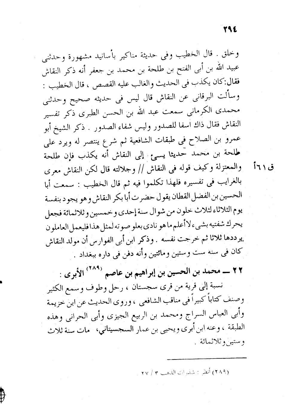 وخلق، قال الخطيب: وفي حديثه مناكير بأسانيد مشهورة، وحدثني عبيد الله بن أبي الفتح، عن طلحة بن محمد بن جعفر أنه ذكر النقاش، فقال: كان يكذب في الحديث، والغالب عليه القصص، قال الخطيب: وسألت البرقاني عن النقاش، فقال: كل حديثه منكر، قال: وحدثني من سمع ذكر تفسير النقاش، فقال: ليس فيه حديث صحيح، وحدثني محمد بن يحيى الكرماني: سمعت هبة الله بن الحسن الطبري، ذكر تفسير النقاش، فقال: ذاك أَشْفَى للصدور، وليس شفاء الصدور، ذكره الشيخ أبو عمرو بن الصلاح في طبقات الشافعية، ثم شرع ينتصر له، ويرد على طلحة بن