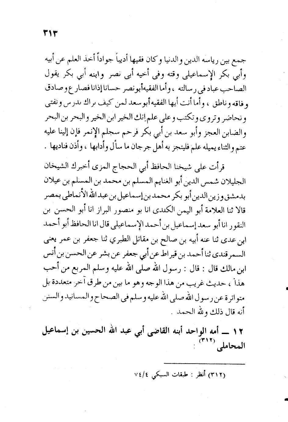 قَرَأْتُ عَلَى شَيْخِنَا الْحَافِظِ أَبِي الْحَجَّاجِ الْمِزِّيِّ: أَخْبَرَكَ الشَّيْخَانِ الْجَلِيلانِ شَمْسُ الدِّينِ أَبُو الْغَنَائِمِ الْمُسْلِمُ بْنُ مُحَمَّدِ بْنِ الْمُسْلِمِ بْنِ غَيْلانَ، بِدِمَشْقَ، وَزَيْنُ الدِّينِ أَبُو بَكْرٍ مُحَمَّدُ بْنُ إِسْمَاعِيلَ بْنِ عَبْدِ اللَّهِ الأَنْمَاطِيُّ، بِمِصْرَ، قَالا: أنا الْعَلامَةُ أَبُو الْيَمَنِ الْكِنْدِيُّ، أنا أَبُو مَنْصُورٍ الْقَزَّازُ، أنا أَبُو الْحُسَيْنِ ابْنُ النَّقُّورِ، أنا أَبُو سَعْدٍ إِسْمَاعِيلُ بْنُ أَحْمَدَ الإِسْمَاعِيلِيُّ، قَالَ: أنا الْحَافِظُ أَبُو أَحْمَدَ بْنُ