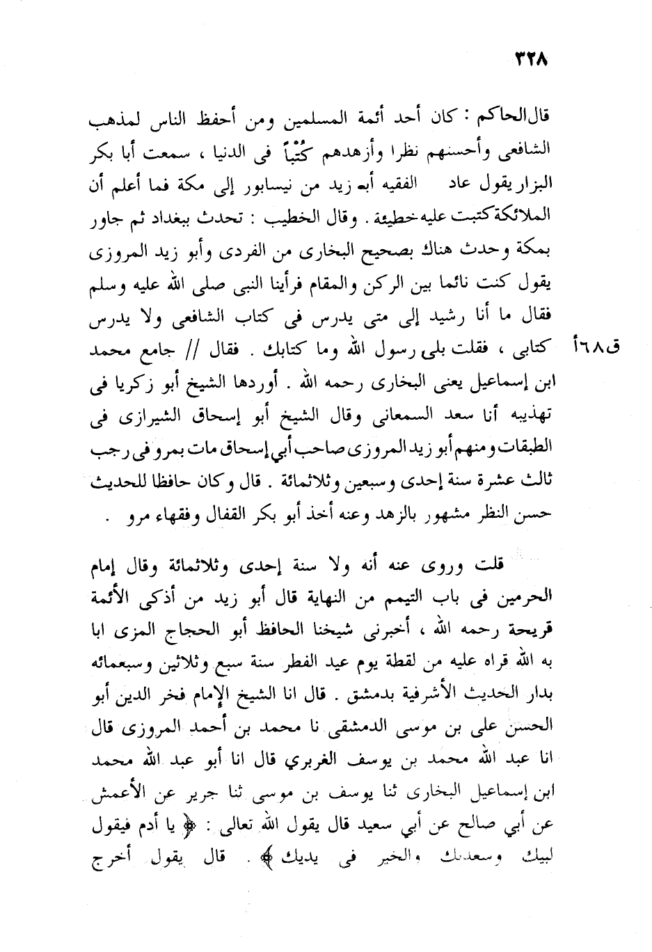 إسماعيل، يعني: البخاري، رحمه الله، أوردها الشيخ أبو زكريا النووي في تهذيبه، أن أبي سعد السمعاني رواها، وقال الشيخ أبو إسحاق الشيرازي في الطبقات: ومنهم: أبو زيد المروزي، صاحب أبي إسحاق، مات بمرو، في رجب ثالث عشر سنة إحدى وسبعين وثلاث مائة، قال: وكان حافظا للمذهب، حسن النظر، مشهورا بالزهد، وعنه أخذ أبو بكر القفال، وفقهاء مرو.