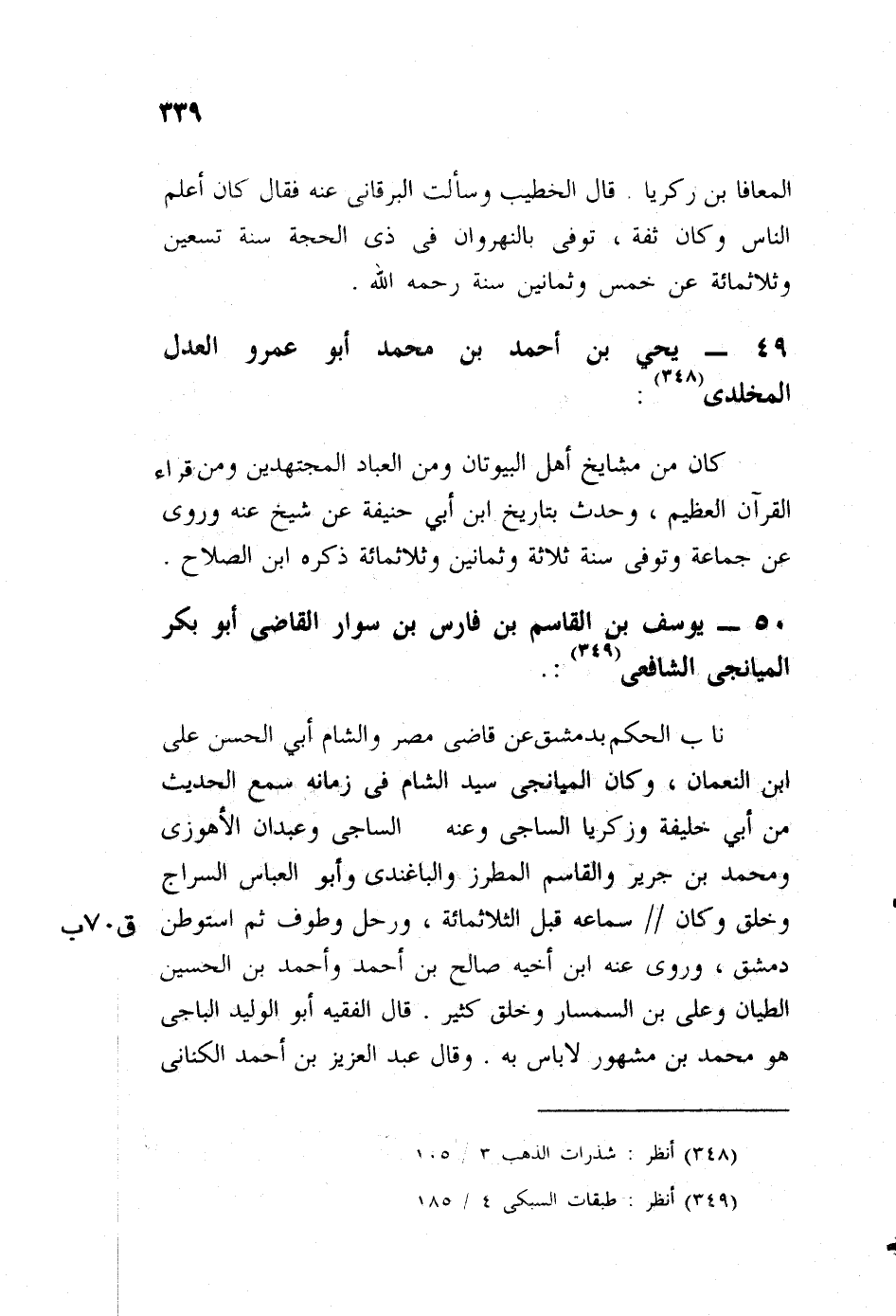 المعافى بن زكريا، قال الخطيب: وسألت البرقاني عنه، فقال: كان أعلم الناس، وكان ثقة، توفي بالنهروان، في ذي الحجة سنة تسعين وثلاث مائة، عن خمس وثمانين سنة، رحمه الله.