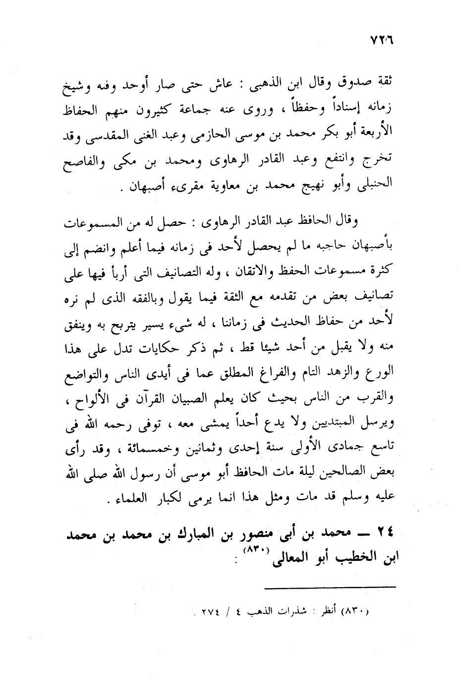 وقال الحافظ عبد القادر الرهاوي: حصل له من المسموعات بأصبهان حاجته ما لم يحصل لأحد في زمانه فيما أعلم، وانضم إلى كثرة مسموعاته الحفظ والإتقان، وله التصانيف التي أربى فيها على تصانيف بعض من تقدمه مع الثقة فيما يقول، وتعففه الذي لم نره لأحد من حفاظ الحديث في زماننا، له شيء يستمد به، ولا يقبل من أحد شيئًا قط، ثم ذكر حكايات تدل على هذا الورع والزهد التام، والفراغ المطلق عما في أيدي الناس والتواضع، والقرب من الناس بحيث كان يعلم الصبيان القرآن في الألواح، ويرسل المبتدئين، ولا يدع أحدًا يمشي معه، توفي رحمه الله في تاسع جمادى الأولى سنة إحدى وثمانين