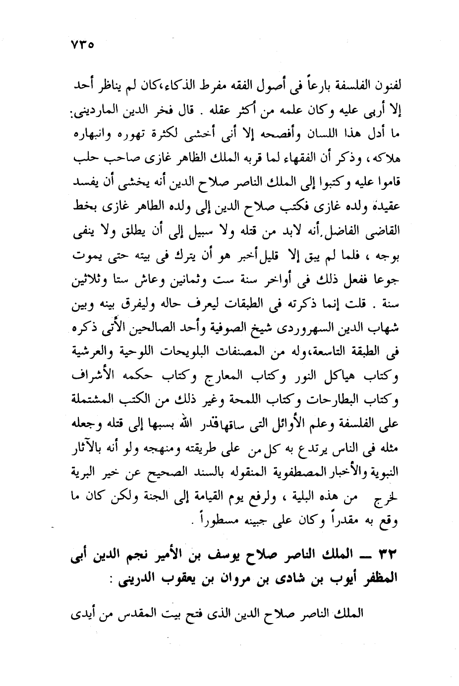الدين إلى ولده الظاهر غازي بخط القاضي الفاضل أنه لا بد من قتله، ولا سبيل إلى أن يطلق ولا ينفى بوجه، فلما لم يبق إلا قتله، اختار هو أن يترك في بيته حتى يموت جوعا، ففعل به ذلك في أواخر سنة ست وثمانين، وعاش ستا وثلاثين سنة، قلت: إنما ذكرته في الطبقات ليعرف حاله، وليفرق بينه وبين الشيخ شهاب الدين السهروردي شيخ الصوفية، وأحد الصالحين الآتي ذكره في الطبقة التاسعة، وله من المصنفات التلويحات اللوحية والعرشية، وكتاب هياكل النور، وكتاب المعارج، وكتاب حكمة الإشراق، وكتاب المطارحات، وكتاب اللمحة وغير ذلك من الكتب المشتملة على الفلسفة، وعلم الأوائل التي