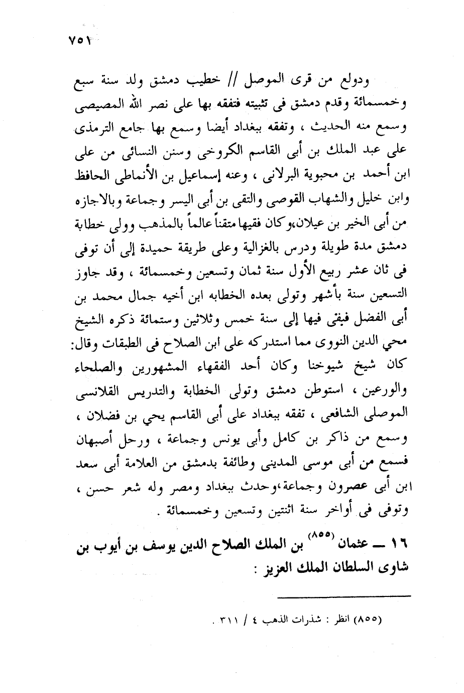 ودولع من قرى الموصل، خطيب دمشق، ولد سنة سبع وخمس مائة، وقدم دمشق في شبيبته، فتفقه بها على نصر الله المصيصي، وسمع منه الحديث، وتفقه ببغداد أيضًا، وسمع بها جامع الترمذي على عبد الملك بن أبي القاسم الكروخي، وسنن النسائي من علي بن أحمد بن نحويه النولاني، وعنه إسماعيل بن الأنماطي الحافظ، وابن خليل، والشهاب القوصي، والتقي بن أبي اليسر، وجماعة، وبالإجازة من ابن أبي الخير، وابن علان، وكان فقيهًا مفتيًا عالمًا بالمذهب، وولي خطابة دمشق مدة طويلة، ودرس بالغزالية، وكان على طريقة حميدة إلى أن توفي في ثاني عشر ربيع الأول سنة ثمان وتسعين وخمس مائة، وقد جاوز