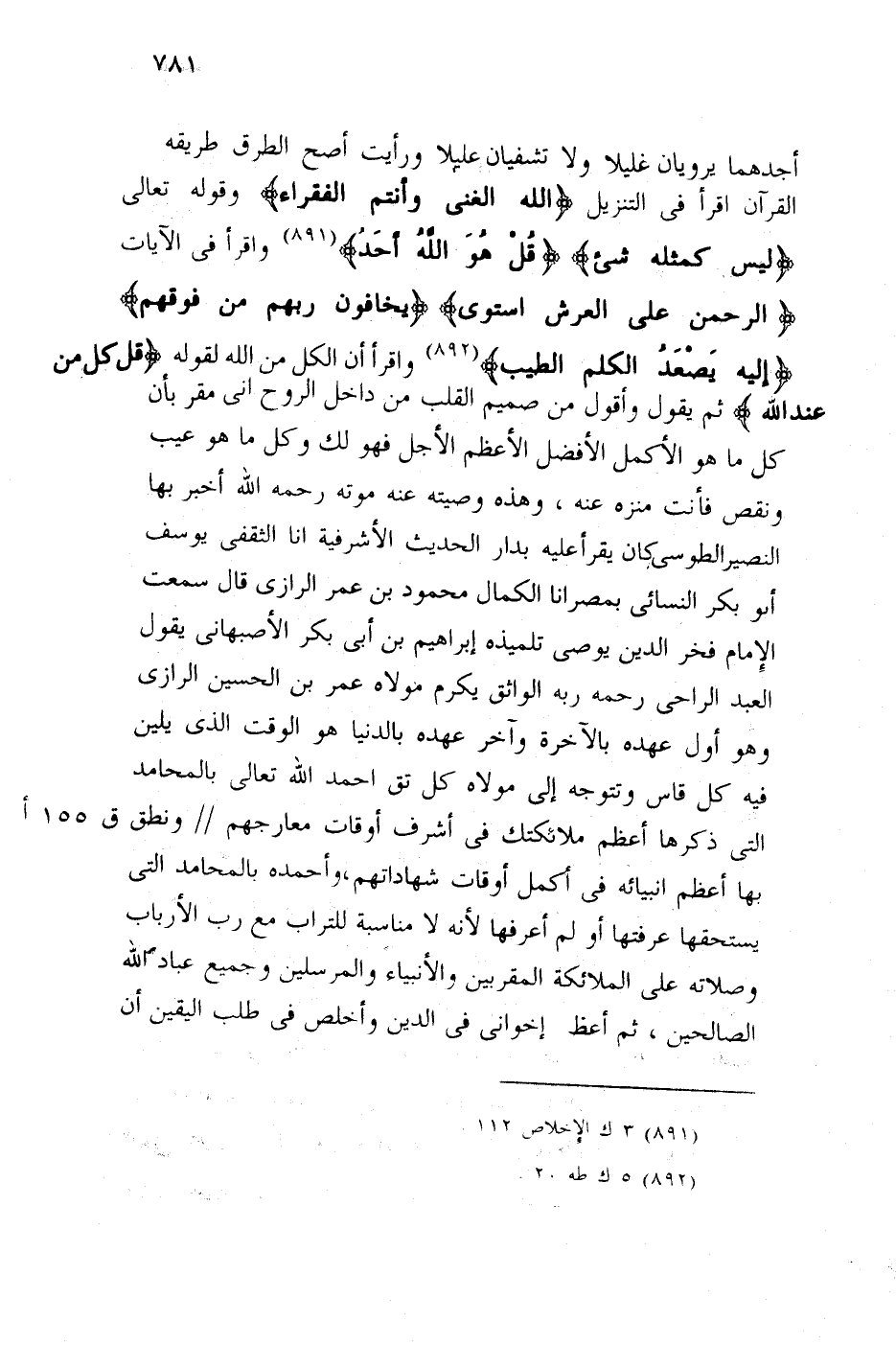 أجدها تروي غليلا ولا تشفي عليلا، ورأيت أصح الطرق طريقة القرآن، اقرأ في التنزيل {وَاللَّهُ الْغَنِيُّ وَأَنْتُمُ الْفُقَرَاءُ} [محمد: 38] ، وقوله تعالى {لَيْسَ كَمِثْلِهِ شَيْءٌ} [الشورى: 11] ، {قُلْ هُوَ اللَّهُ أَحَدٌ} [الإخلاص: 1] واقرأ في الآيات {الرَّحْمَنُ عَلَى الْعَرْشِ اسْتَوَى} [طه: 5] ، {يَخَافُونَ رَبَّهُمْ مِنْ فَوْقِهِمْ} [النحل: 50] ، {إِلَيْهِ يَصْعَدُ الْكَلِمُ الطَّيِّبُ} [فاطر: 10] ، واقرأ أن الكل من الله قوله تعالى {قُلْ كُلٌّ مِنْ عِنْدِ اللَّهِ} [النساء: 78] ، ثم