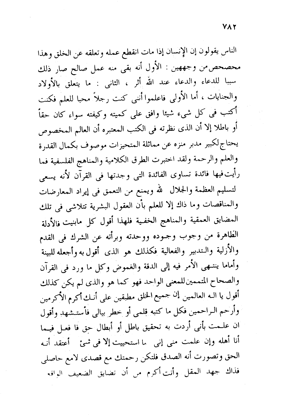 الثاني: ما يتعلق بالأولاد وأداء الجنايات، أما الأول: فاعلموا أني كنت رجلًا محبًا للعلم، فكنت أكتب في كل شيء شيئًا، وأقف على كميته وكيفيته سواء كان حقا أو باطلًا إلا أن الذي نظرته في الكتب المعتبرة أن العالم المخصوص تحت تدبير مدبر منزه عن مماثلة المتحيزات موصوف بكمال القدرة والعلم والرحمة، ولقد اختبرت الطرق الكلامية، والمناهج الفلسفية فما رأيت فيها فائدة تساوي الفائدة التي وجدتها في القرآن، لأنه يسعى في تسليم العظمة والجلالة لله، ويمنع عن التعمق في إيراد المعارضات والمناقصات، وما ذلك إلا للعلم بأن العقول البشرية تتلاشى في تلك المضايق العميقة،