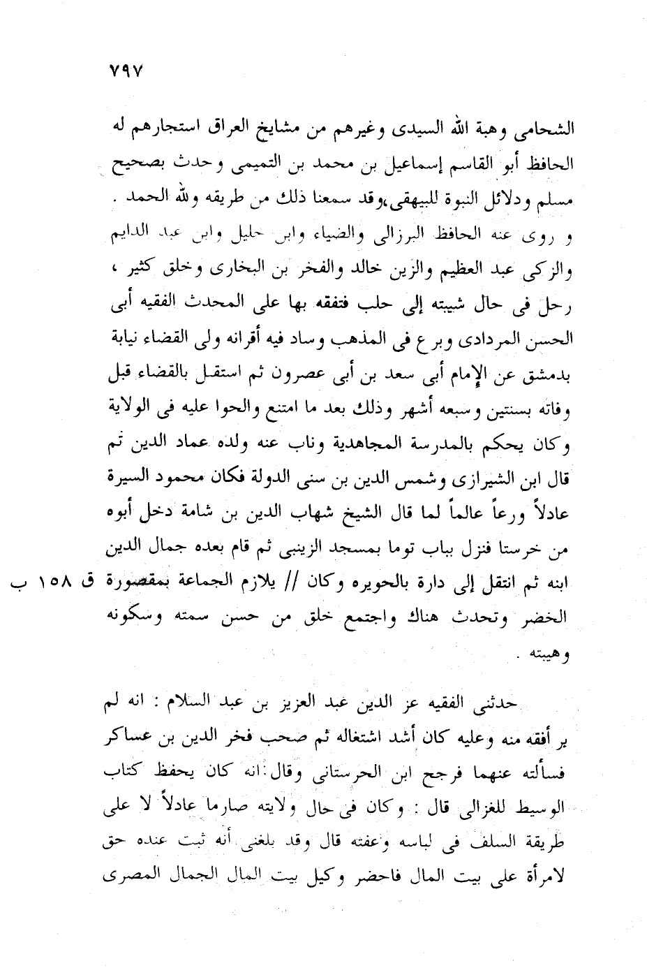 شهاب الدين أبو شامة: دخل أبوه من حرستان، فنزل بباب يوما وأم بمسجد الزينبي، ثم أم فيه بعده جمال الدين ابنه، ثم انتقل إلى داره بالحويرة وكان يلازم الجماعة بمقصورة الخضر، ويحدث هناك ويجتمع خلق كثير من حسن سمته وسكونه وهيبته.