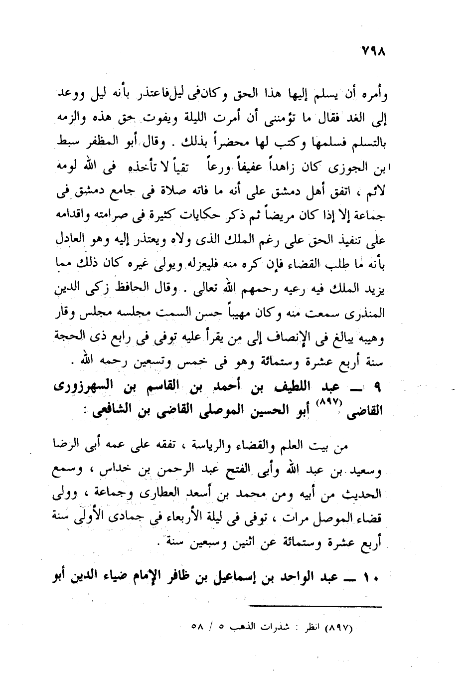وأمره أن يسلم إليها هذا الحق، فاعتذر بأنه ليل ووعد إلى الغد، فقال: ما يؤمنني أن أموت الليلة، ويفوت حق هذه وألزمه بالتسليم، فسلمها، وكتب لها محضرًا بذلك، وقال أبو المظفر ابن الجوزي: كان زاهدًا