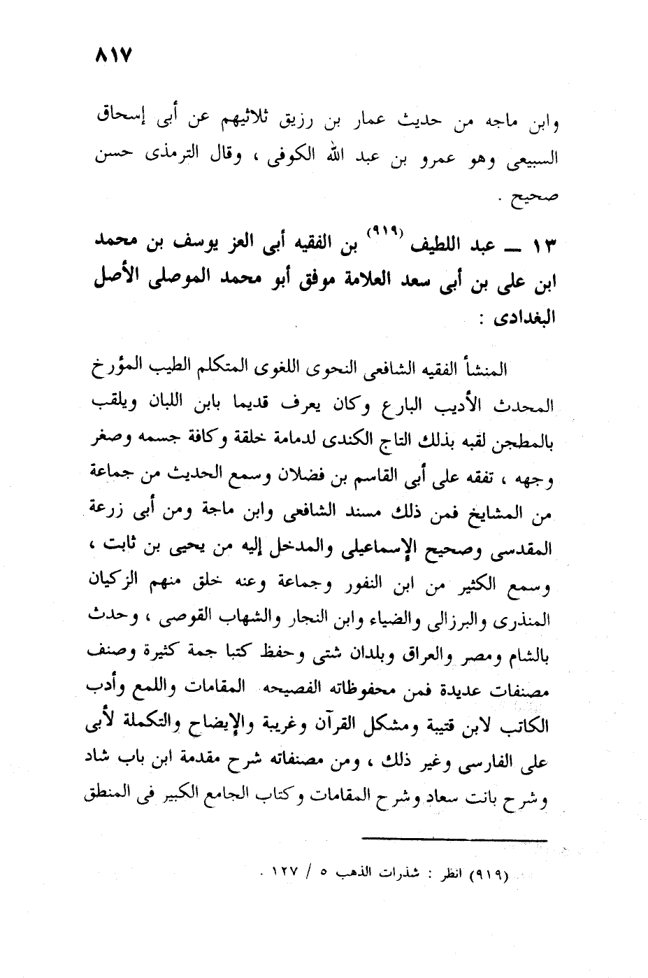 الفقيه الشافعي النحوي اللغوي المتكلم الطبيب المؤرخ المحدث الأديب البارع، وكان يعرف قديما بابن اللبان ويلقب بالمطجن، لقبه بذلك التاج الكندي لدمامة خلقه ونحافة جسمه وصغر وجهه، تفقه ببغداد على أبي القاسم بن فضلان، وسمع الحديث من جماعة من المشايخ فمن ذلك مسند الشافعي، وابن ماجه من أبي زرعة المقدسي، وصحيح الإسماعيلي، والمدخل إليه من يحيى بن ثابت، وسمع الكثير من ابن البطي، وابن النقور وجماعة، وعنه خلق منهم الزكيان المنذري والبرزالي، وابن النجار، والشهاب القوصي، وحدث بالشام، ومصر، والعراق، وبلدان شتى، وحفظ كتبًا جم، وصنف مصنفات عديدة فمن محفوظاته