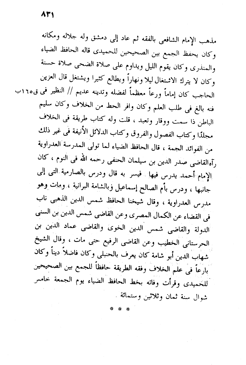 قلت: وله كتاب ظريف في الخلاف مجلدا، وكتاب الفصول والفروق وكتاب الدلائل الأنيقة في غير ذلك من الفوائد الجمة، قال الحافظ الضياء: لما تولى المدرسة العذراوية رآه القاضي صدر الدين ابن سليمان الحنفي رحمه الله، في النوم، كان الإمام أحمد يدرس فيها فيسر به، قال: ودرس بالصارمية التي إلى جانبها، ودرس بأم الصالح إسماعيل، وبالشامية البرانية، ومات وهو مدرس العذراوية، وقال شيخنا الحافظ شمس الدين الذهبي: ناب في القضاء عن الكمال المصري، وعن القاضي شمس الدين ابن سني الدولة، والقاضي شمس الدين الخويي، والقاضي عماد الدين الحرستاني الخطيب، وعن القاضي الرفيع حتى