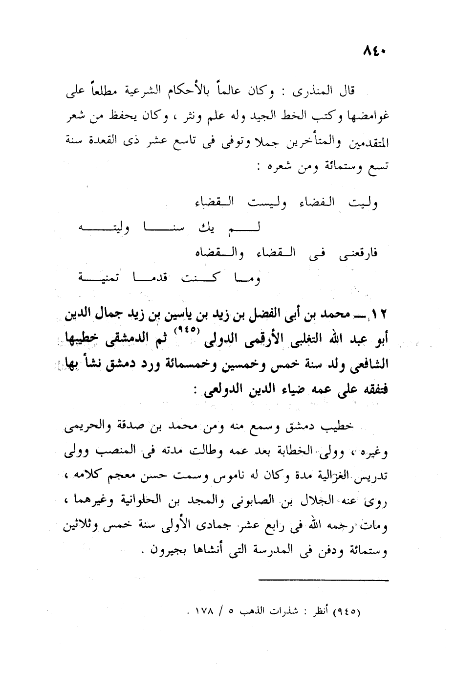 قال المنذري: وكان عالمًا بالأحكام الشرعية مطلعًا على غوامضها، وكتب الخط الجيد وله نظم ونثر، وكان يحفظ من شعر المتقدمين والمتأخرين جملة، وتوفي في تاسع عشر ذي القعدة سنة تسع وثلاثين وست مائة ومن شعره: